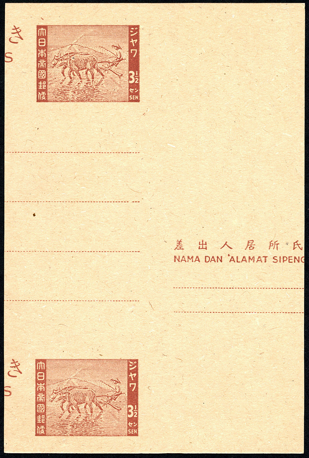 Java. Wrongly cut proof of 121.5 x 81 mm for a 3½ sen postcard in red-brown, Japanese type of a ploughing buffalo, Bu.6A