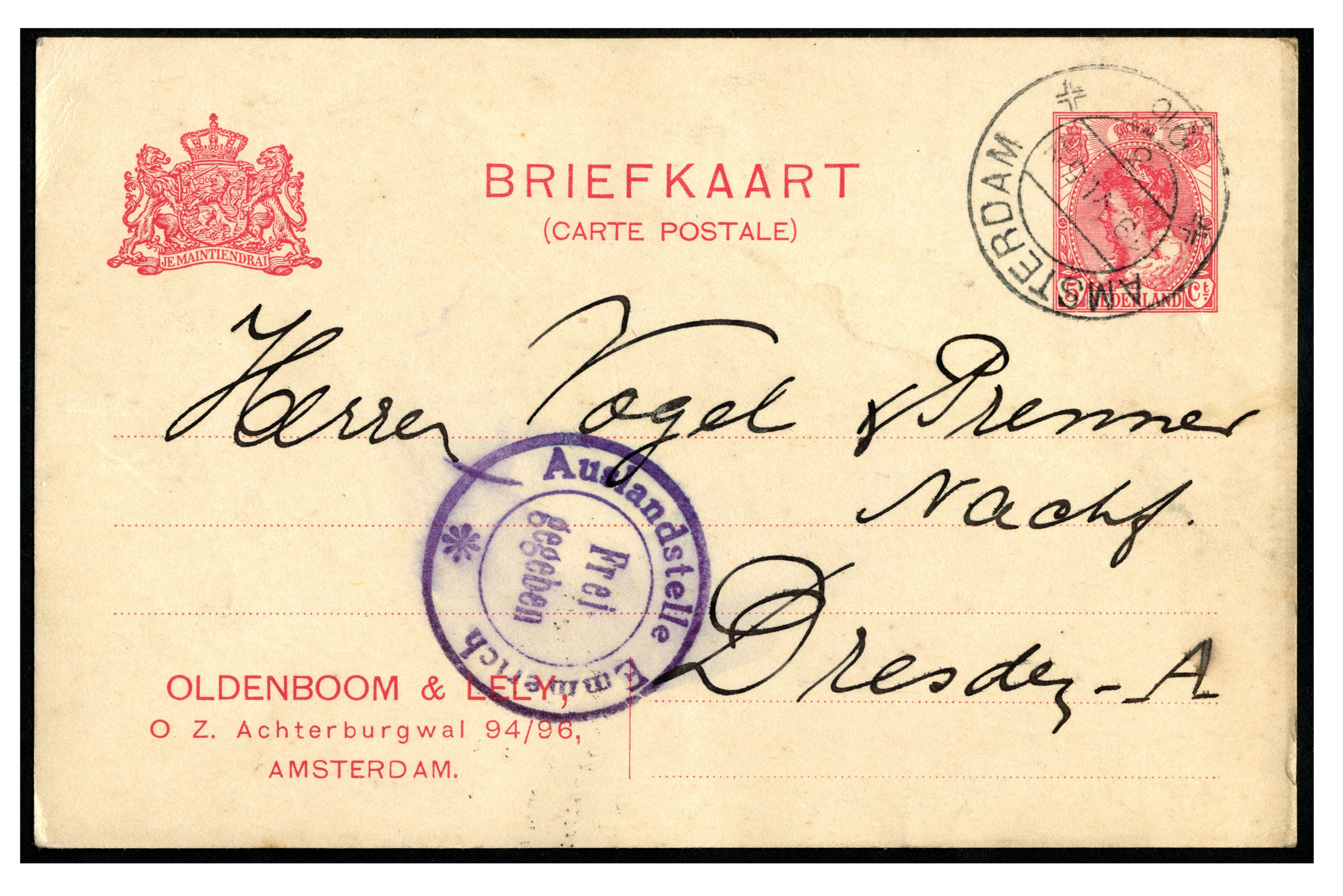 Particuliere bk. van 5 cent Bontkraag P84a-I-b van Amsterdam 19-6-1916 naar Dresden, in Emmerich gecensureerd. Zakelijk gebruikt. Schaarse kaart die aan de redactie (2008) is gemeld, maar die zij nog niet zelf heeft gezien