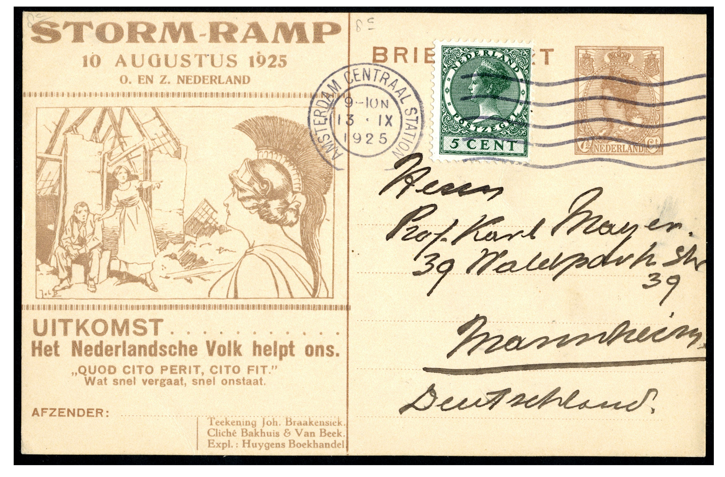 Particulier bedrukte bk. Huygens, Stormramp 1925 STR3, 1 ongebruikte kaart en 2 verzonden kaarten van Amsterdam C.S. 27-9-1925 naar Den Haag resp. met 5c Veth bijgefrankeerd van Amsterdam C.S. 13-9-1925 naar Mannheim