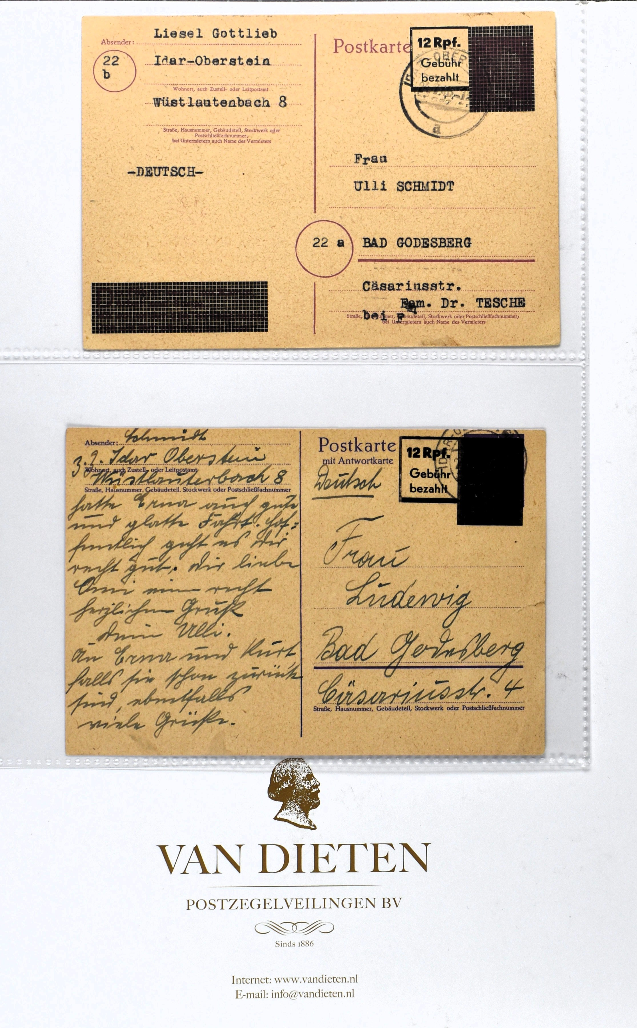 GERMANY. Two different 6 pf postcards (1 with small tear) with the image of Hitler overprinted and re-valued 12 Rpf. both from a woman to her mother, sent from Idar-Oberstein 24 July 1946 respectively 23 Aug 1946 to Bad Godesberg