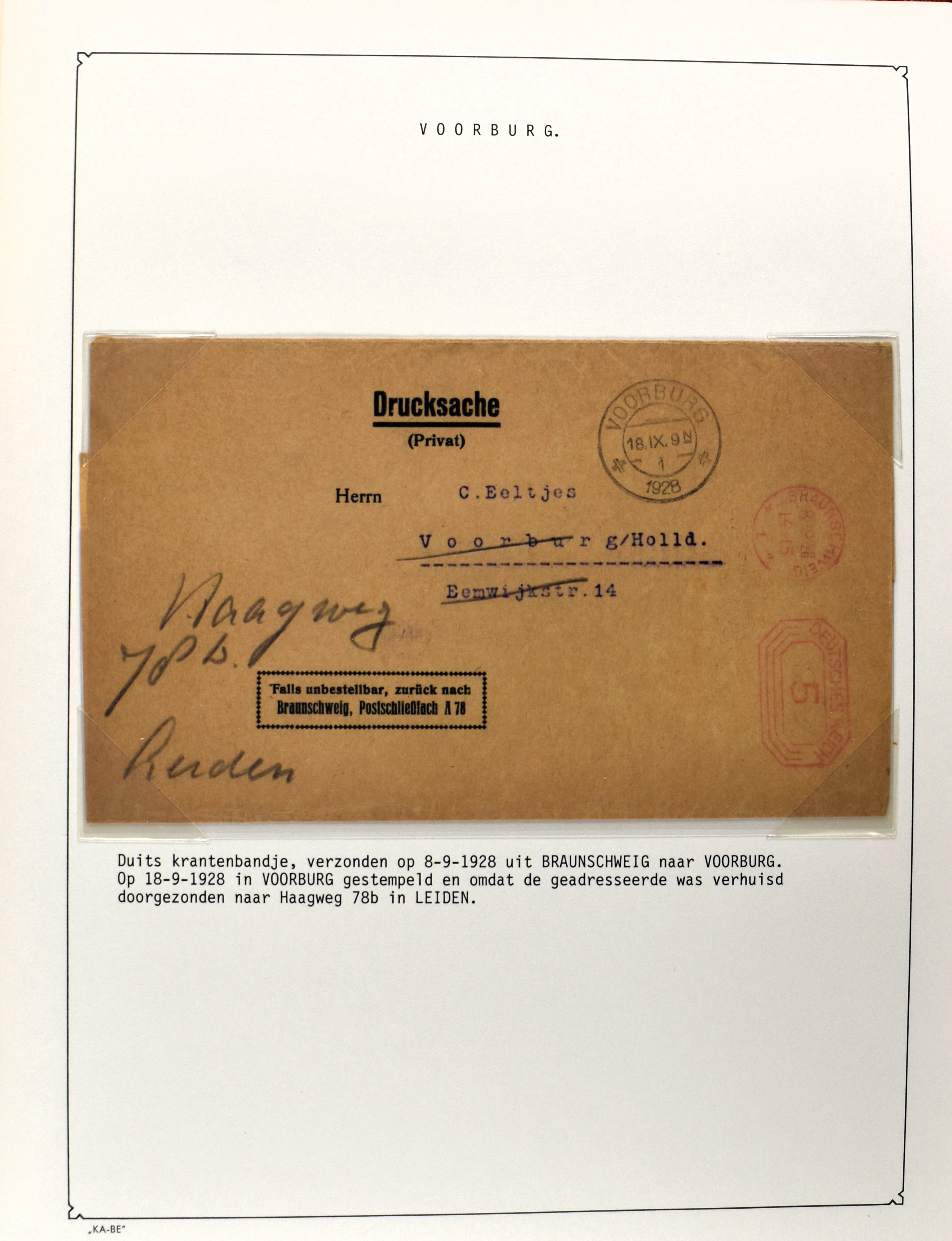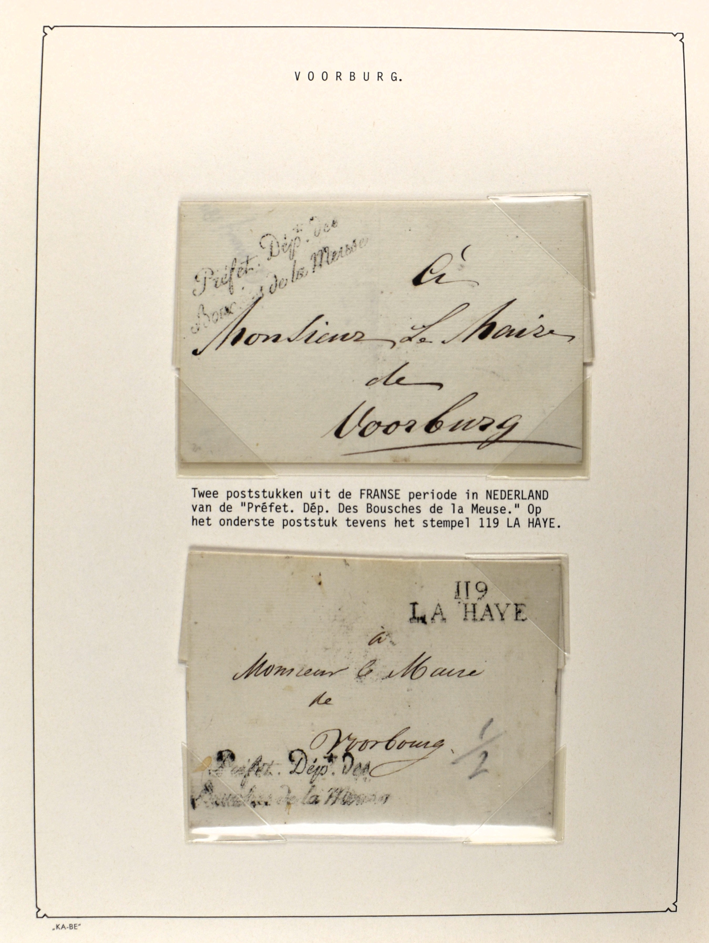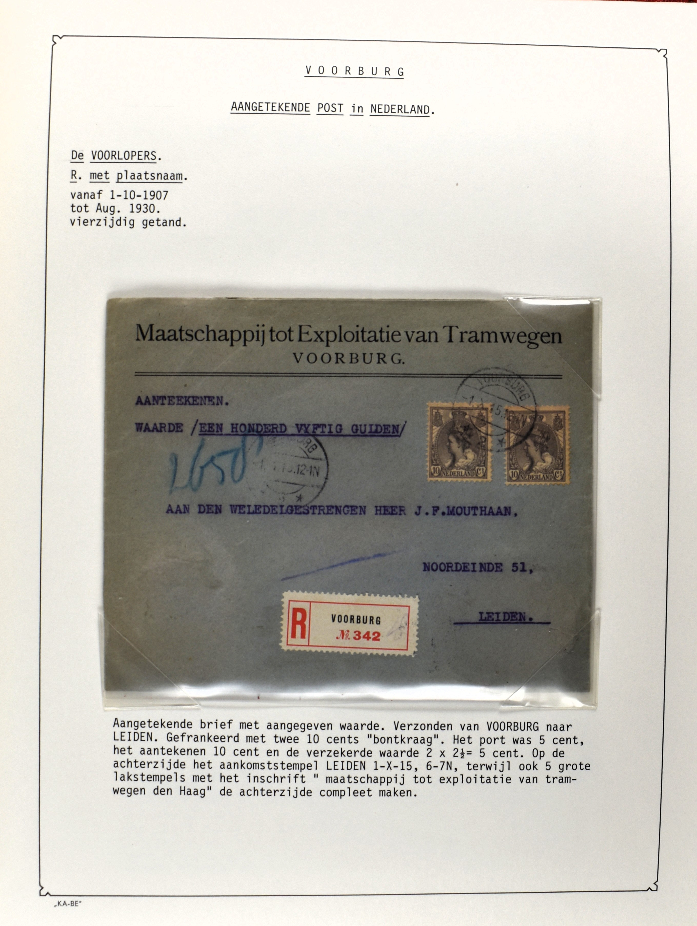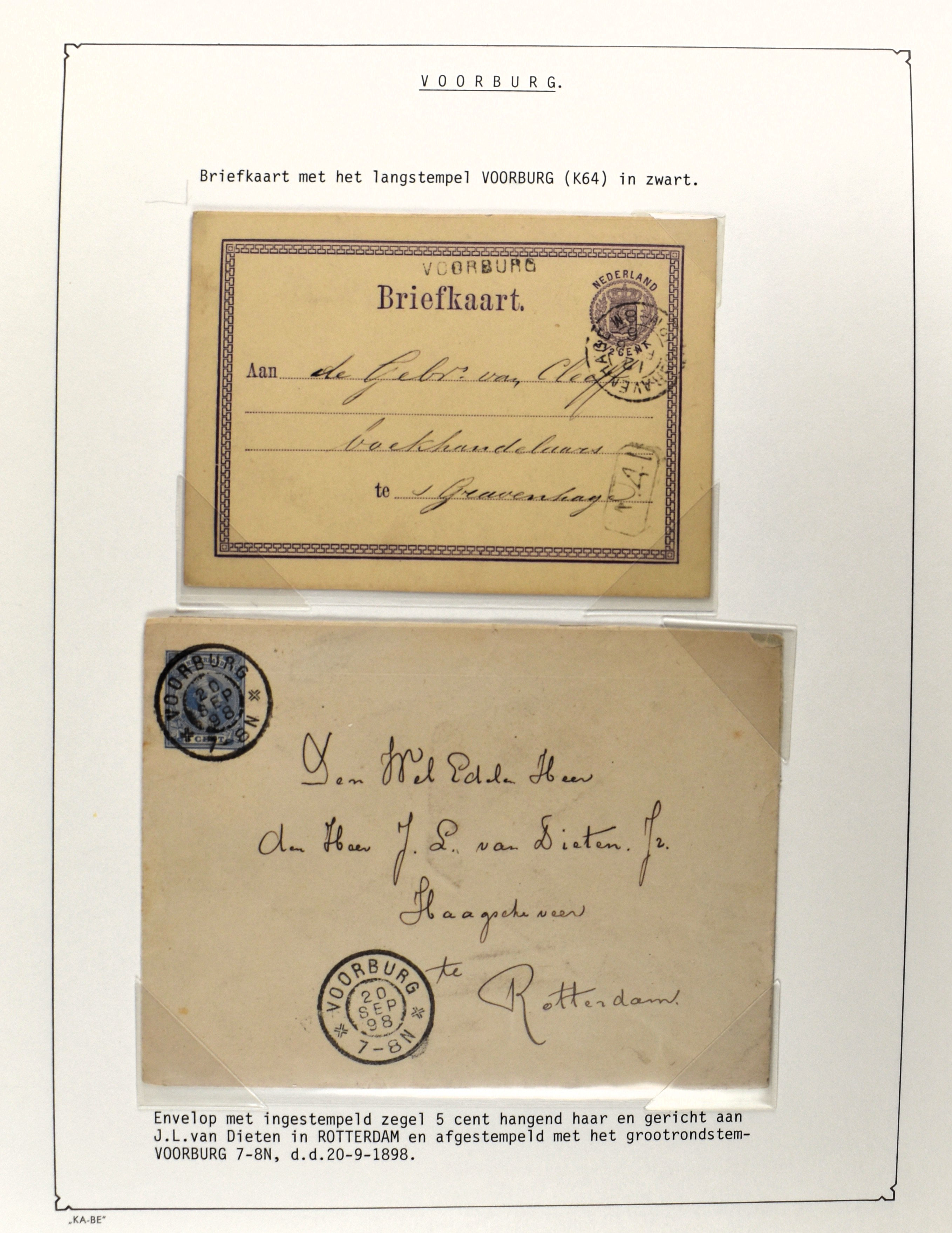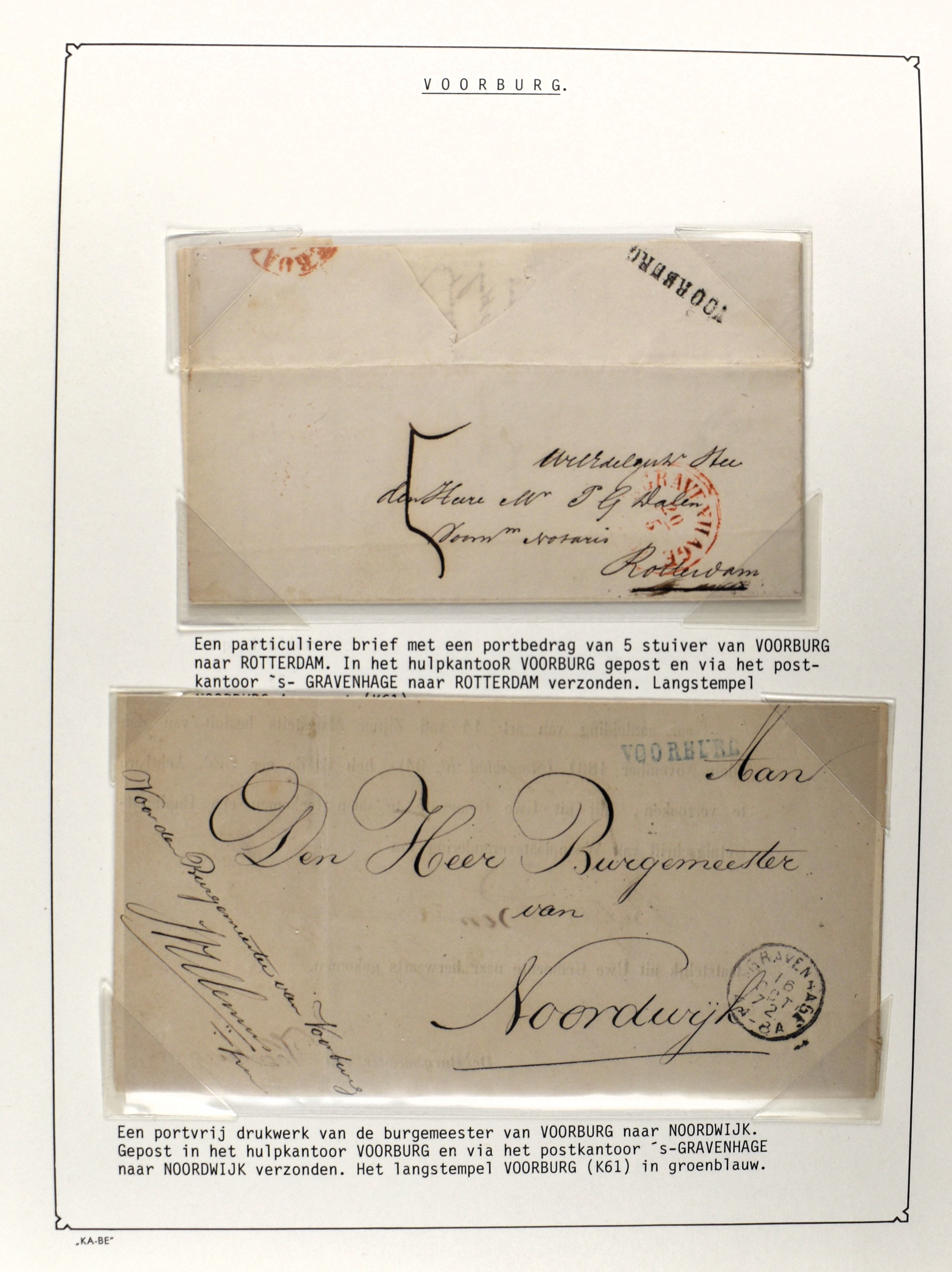 POSTHISTORIE VOORBURG, gespecialiseerde verzameling van ca. 60 poststukken uit of naar Voorburg vanaf periode voorfilatelie, met een grote verscheidenheid aan stempels, frankeringen, soorten poststukken, dienstpost, aangetekend (R-strookjes ook van bijpostkantoren), aangegeven waarde, beport, censuur, etc. en tevens wat documenten, punt- en kleinrond op losse zegels van diverse emissies en waarden, op bladen in KaBe-album