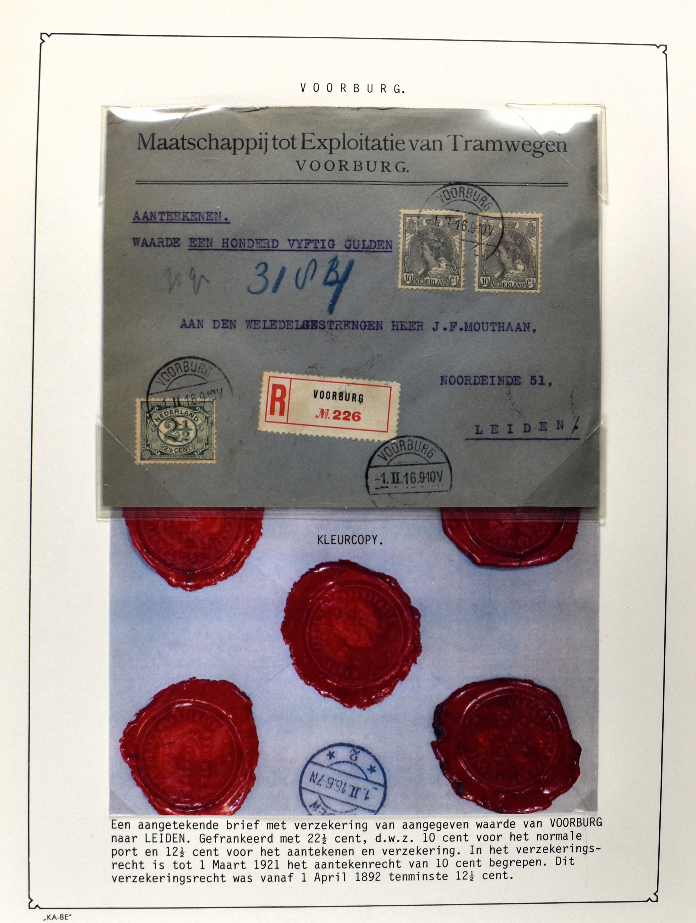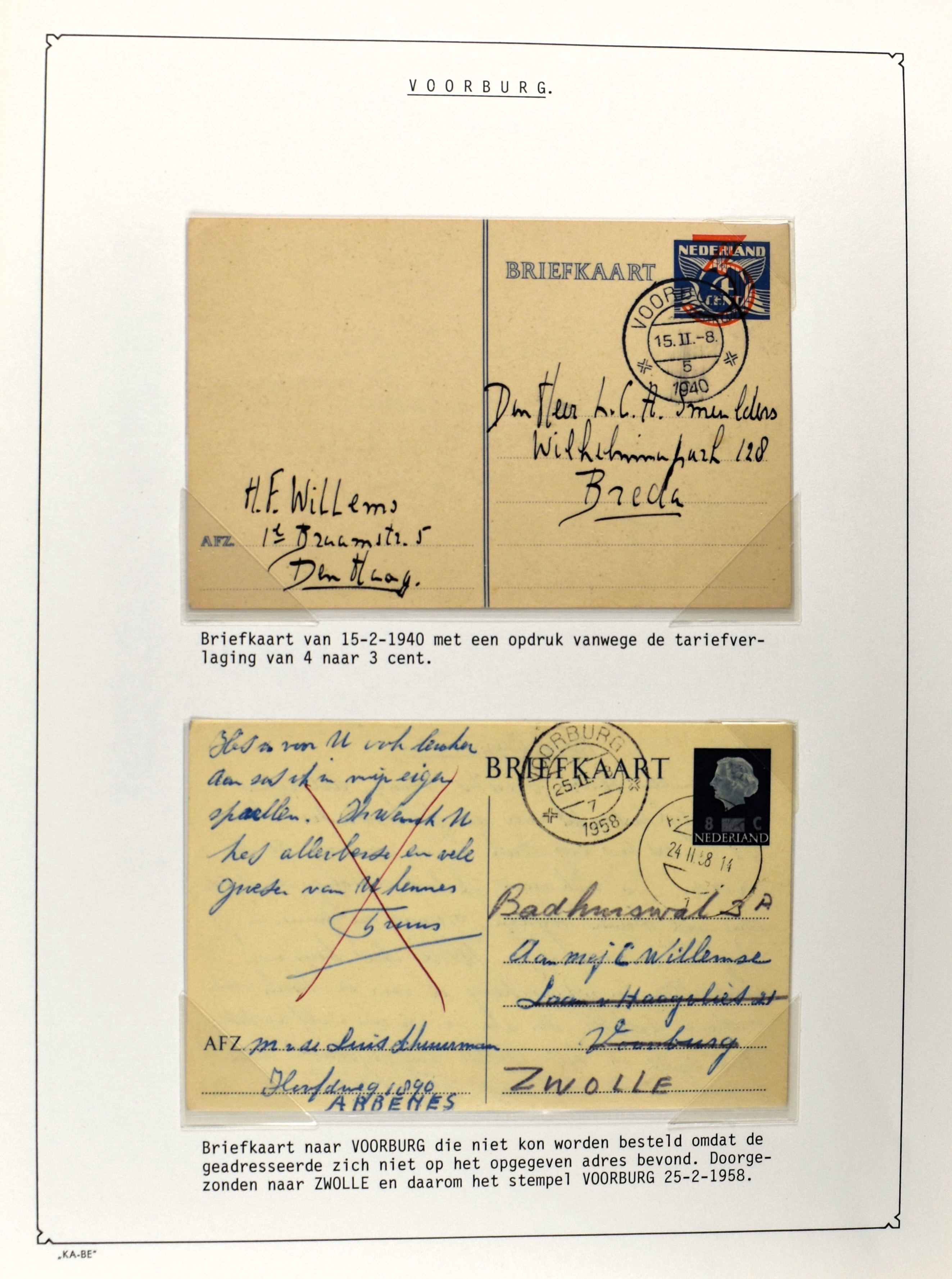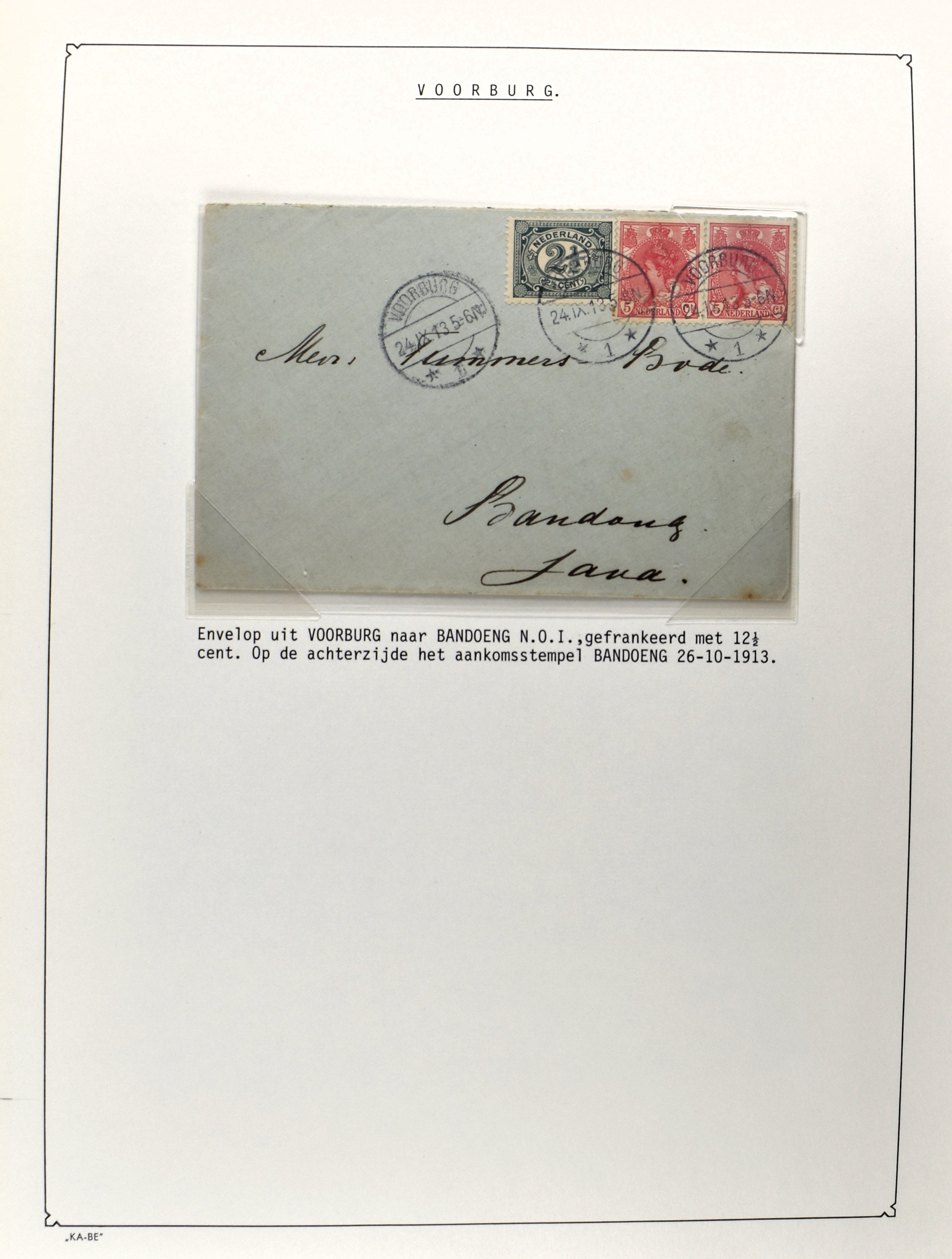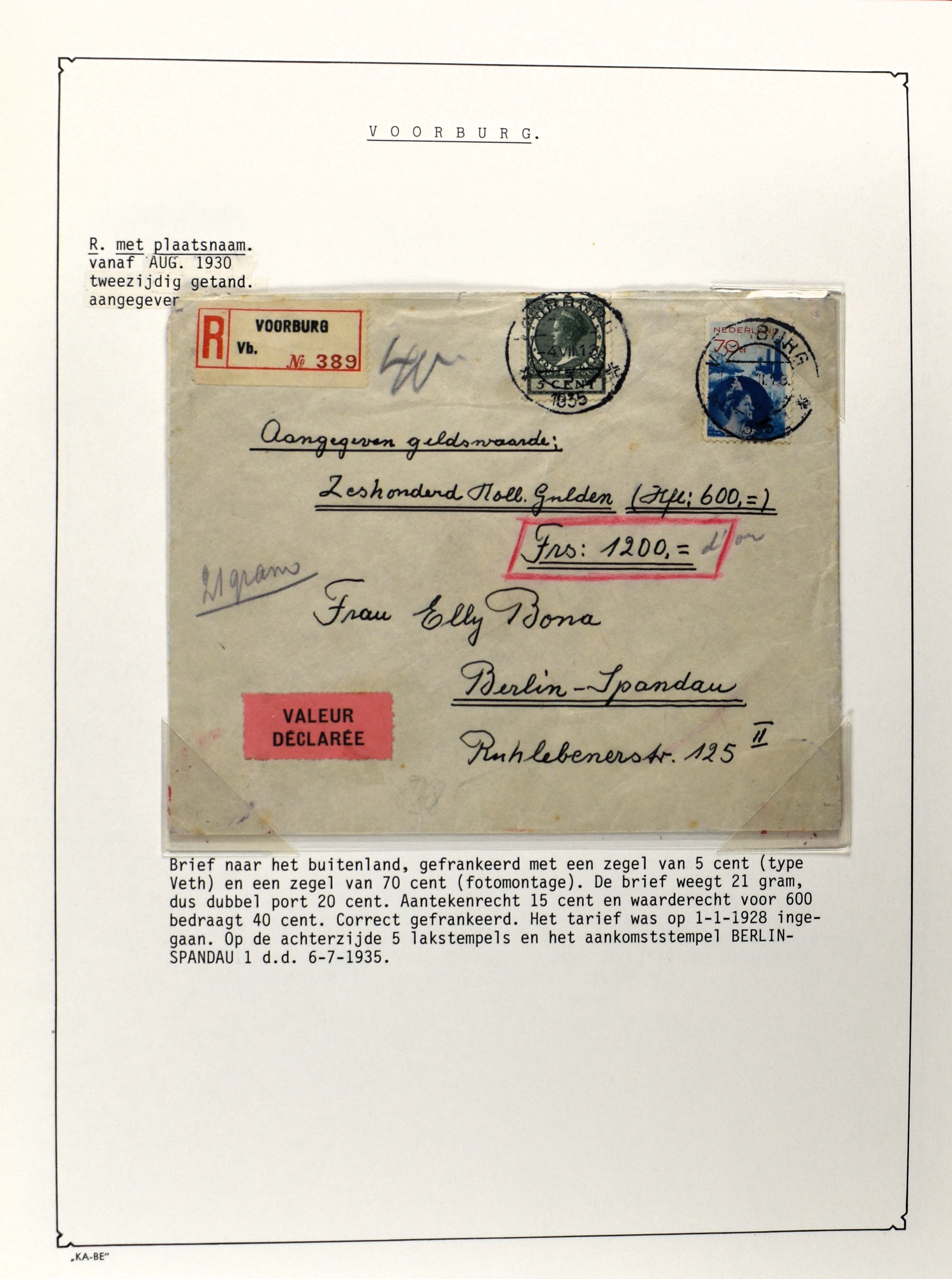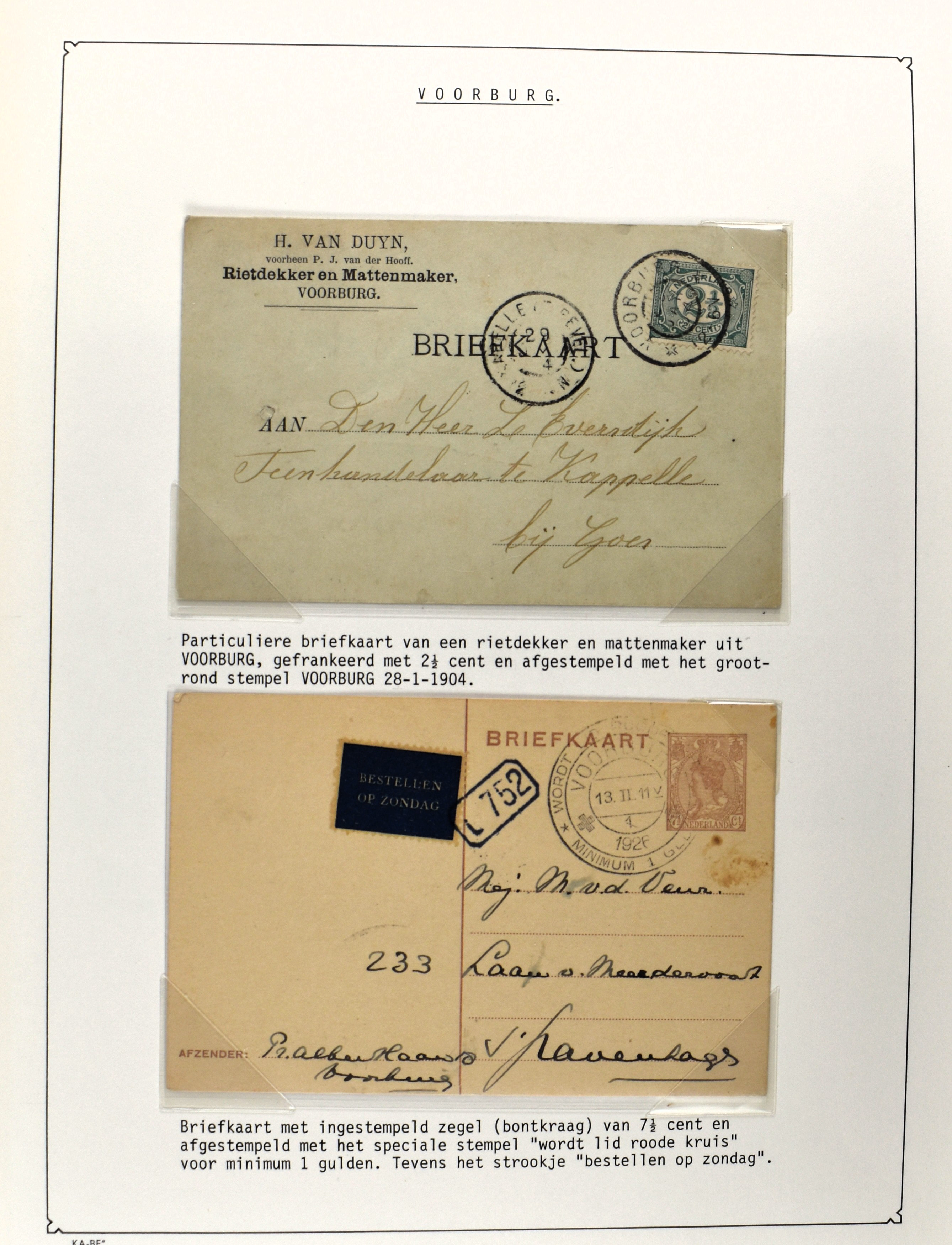 POSTHISTORIE VOORBURG, gespecialiseerde verzameling van ca. 60 poststukken uit of naar Voorburg vanaf periode voorfilatelie, met een grote verscheidenheid aan stempels, frankeringen, soorten poststukken, dienstpost, aangetekend (R-strookjes ook van bijpostkantoren), aangegeven waarde, beport, censuur, etc. en tevens wat documenten, punt- en kleinrond op losse zegels van diverse emissies en waarden, op bladen in KaBe-album