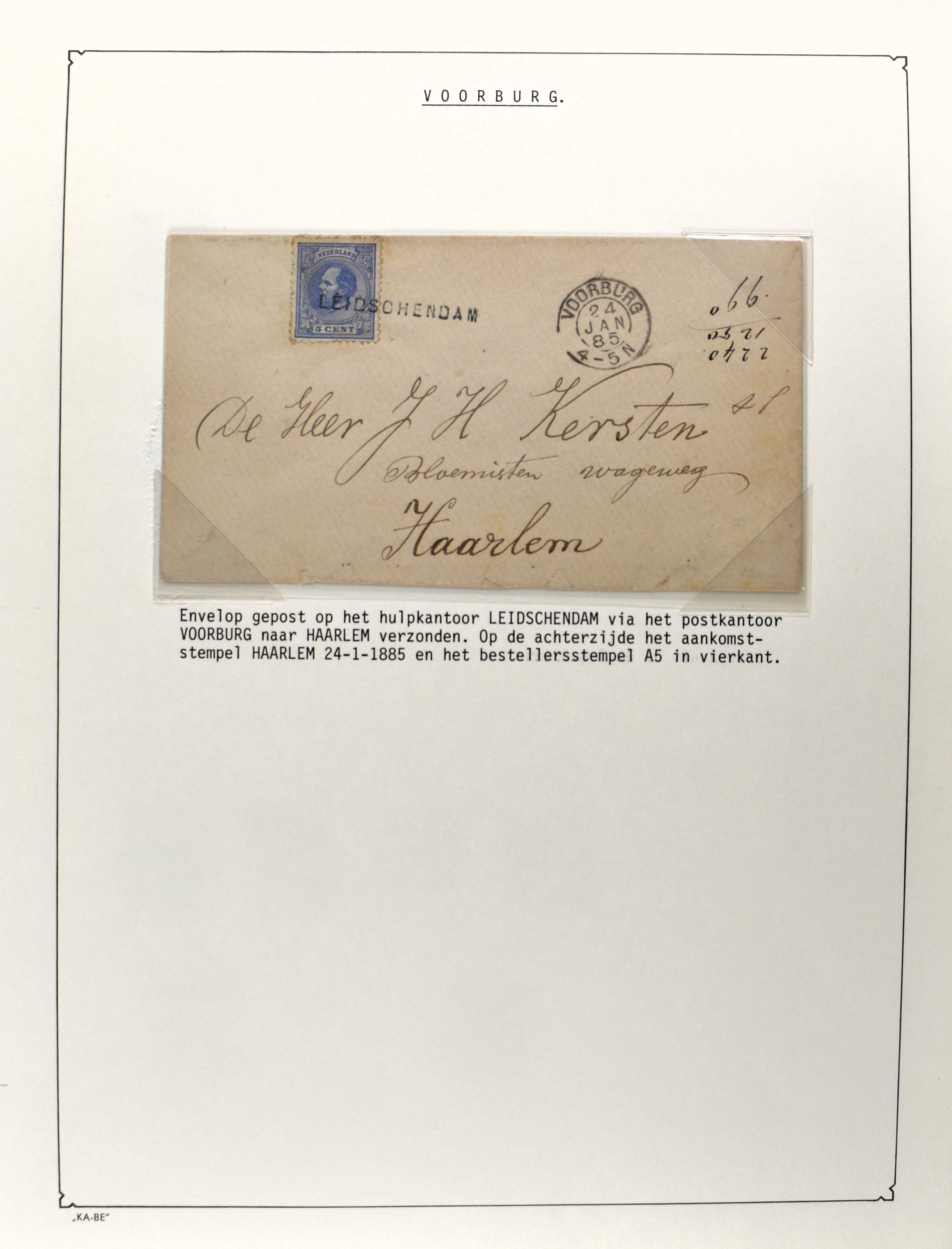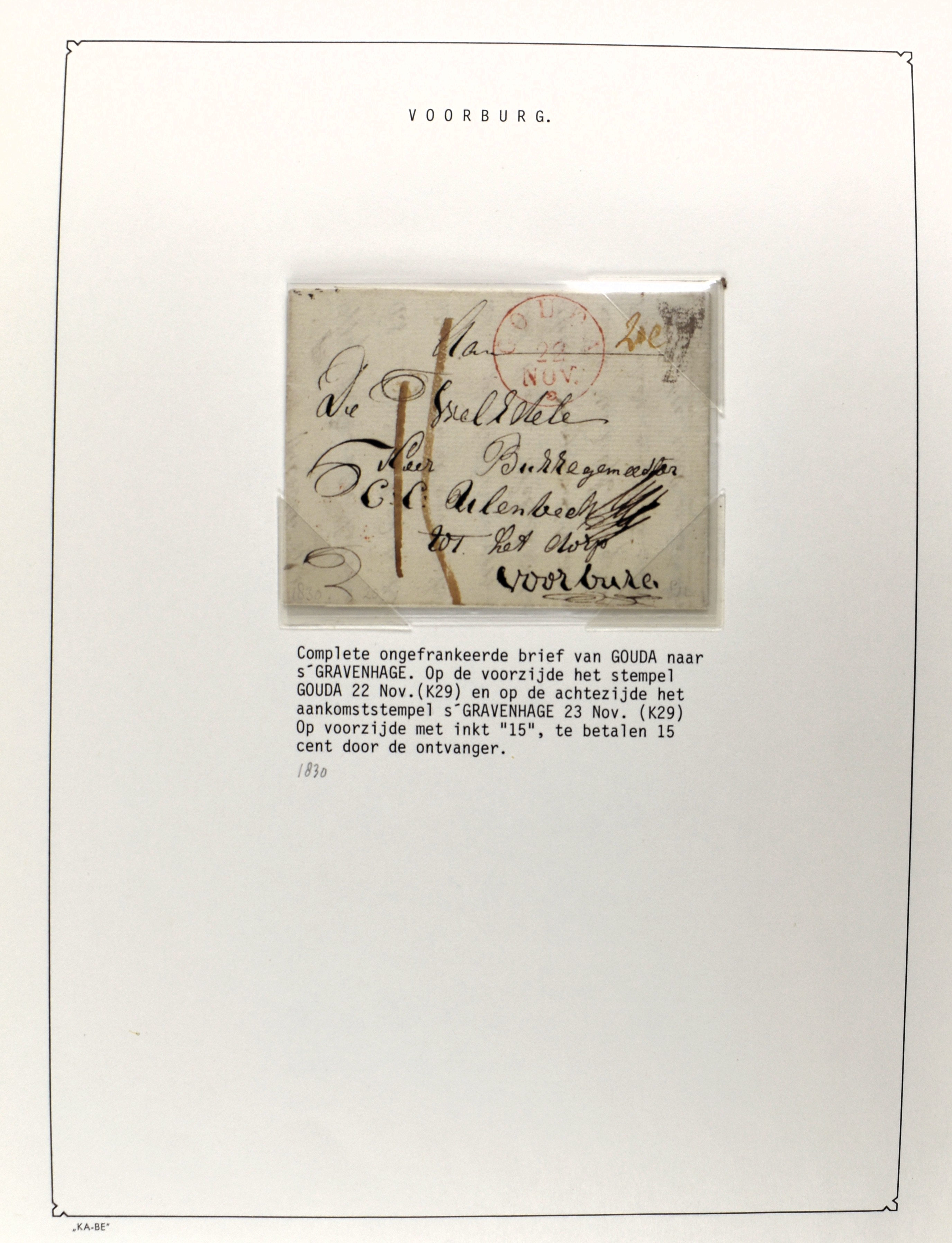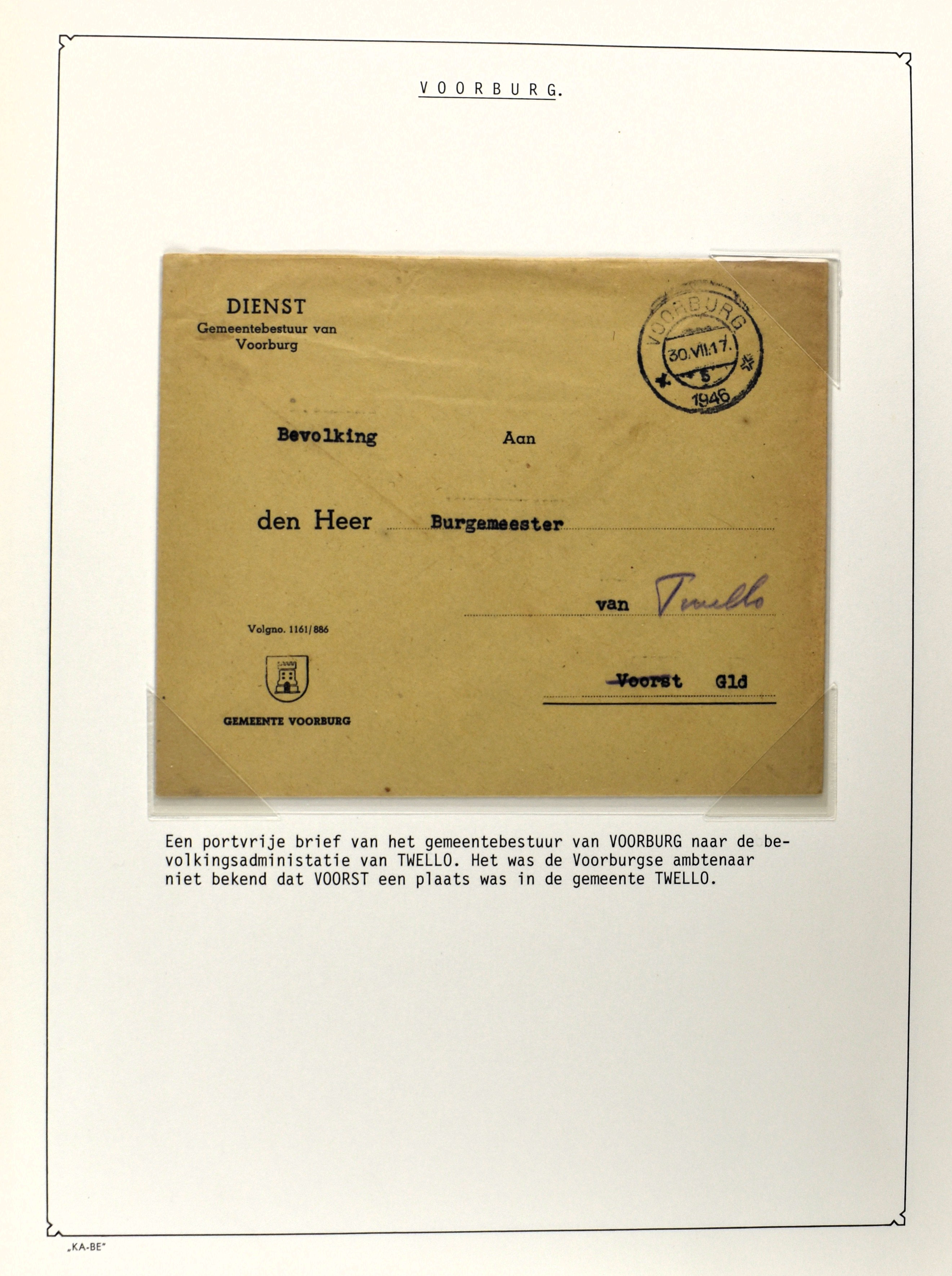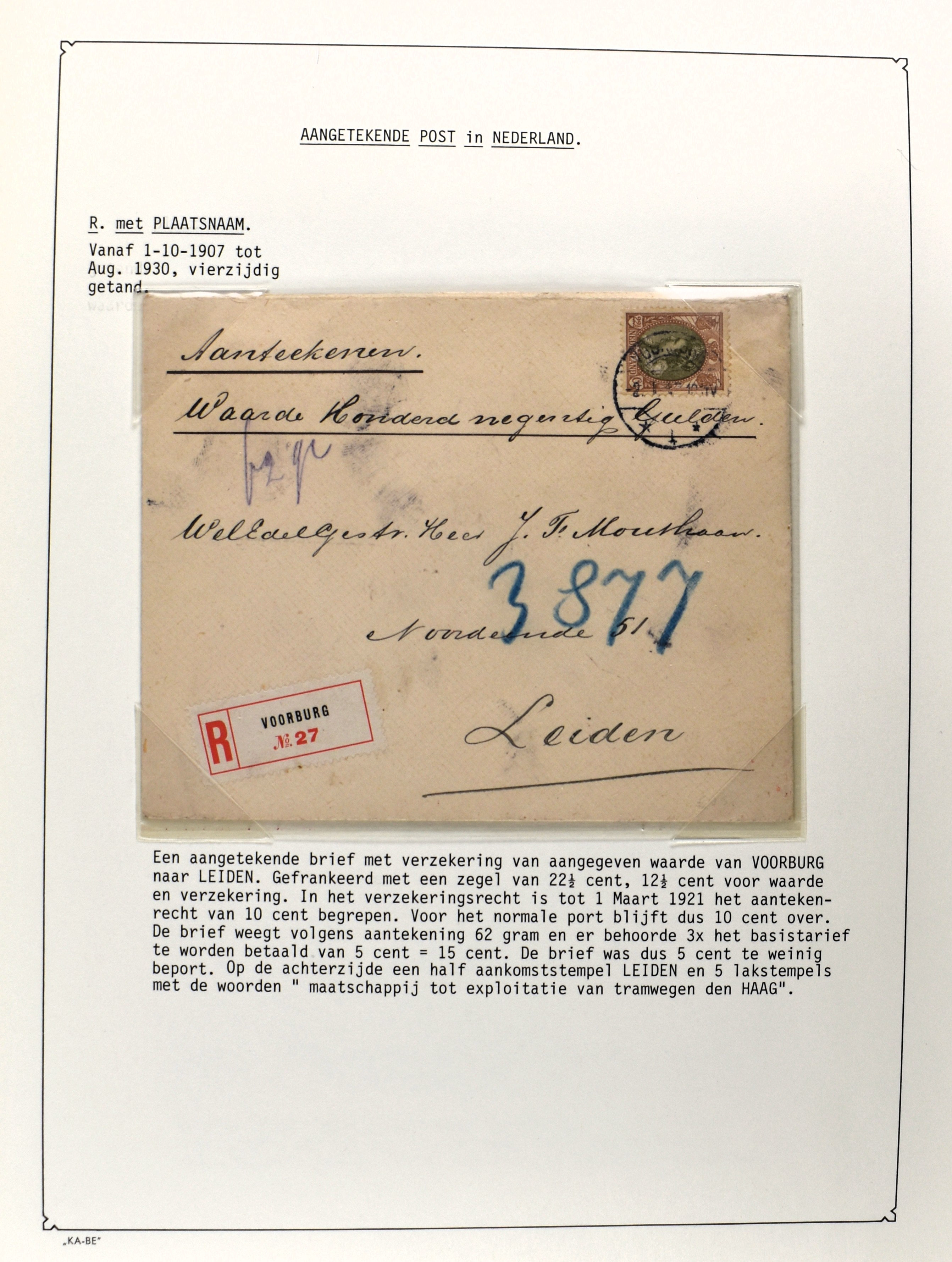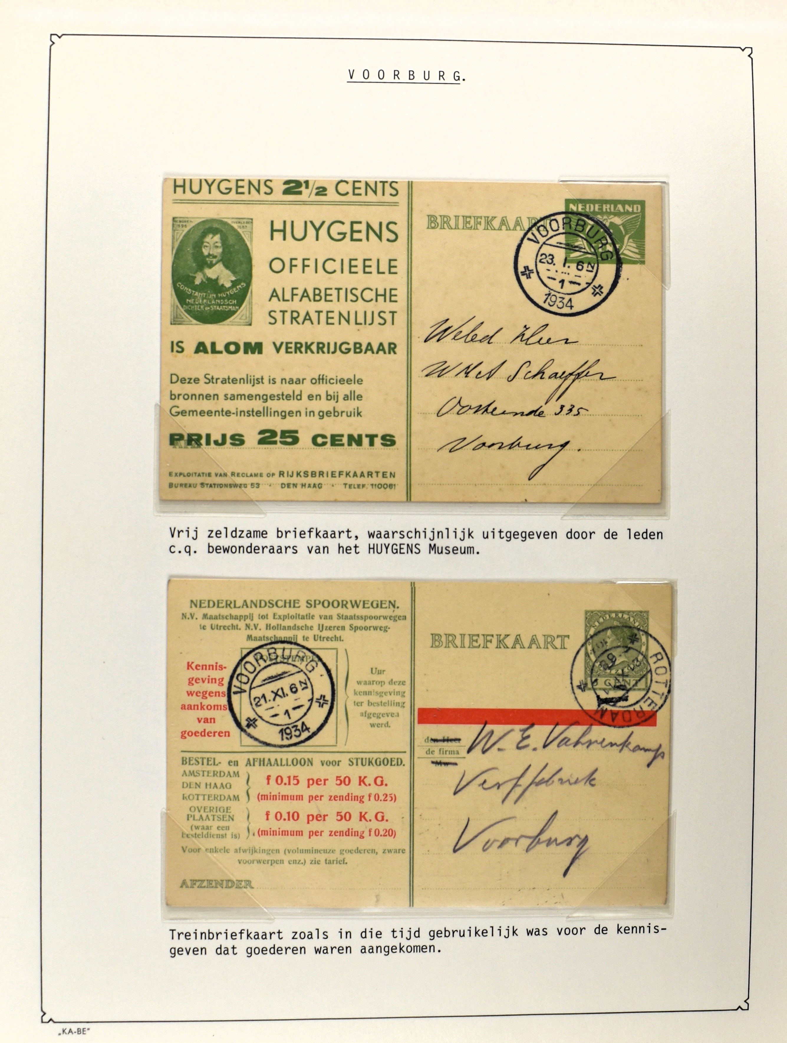 POSTHISTORIE VOORBURG, gespecialiseerde verzameling van ca. 60 poststukken uit of naar Voorburg vanaf periode voorfilatelie, met een grote verscheidenheid aan stempels, frankeringen, soorten poststukken, dienstpost, aangetekend (R-strookjes ook van bijpostkantoren), aangegeven waarde, beport, censuur, etc. en tevens wat documenten, punt- en kleinrond op losse zegels van diverse emissies en waarden, op bladen in KaBe-album