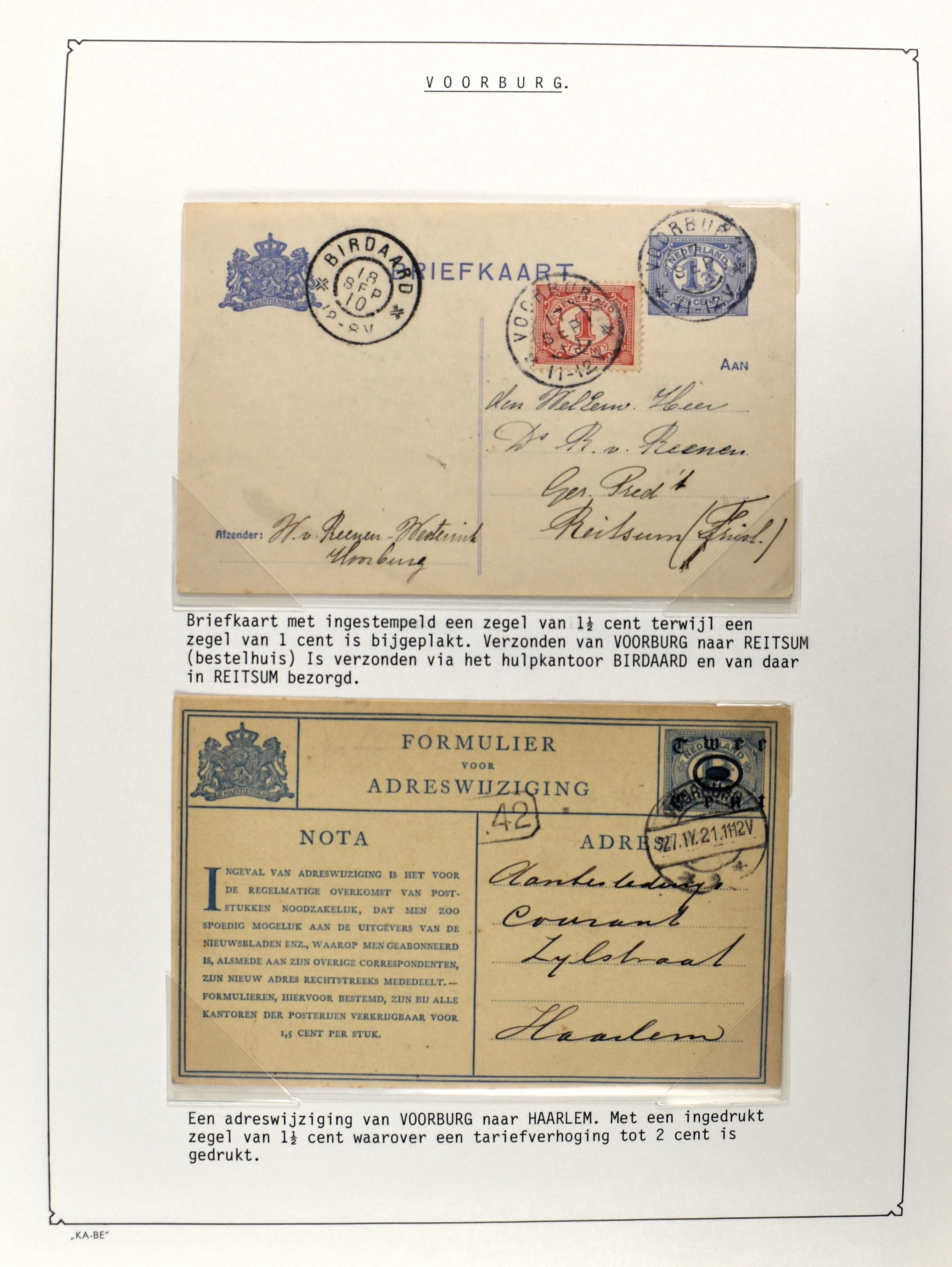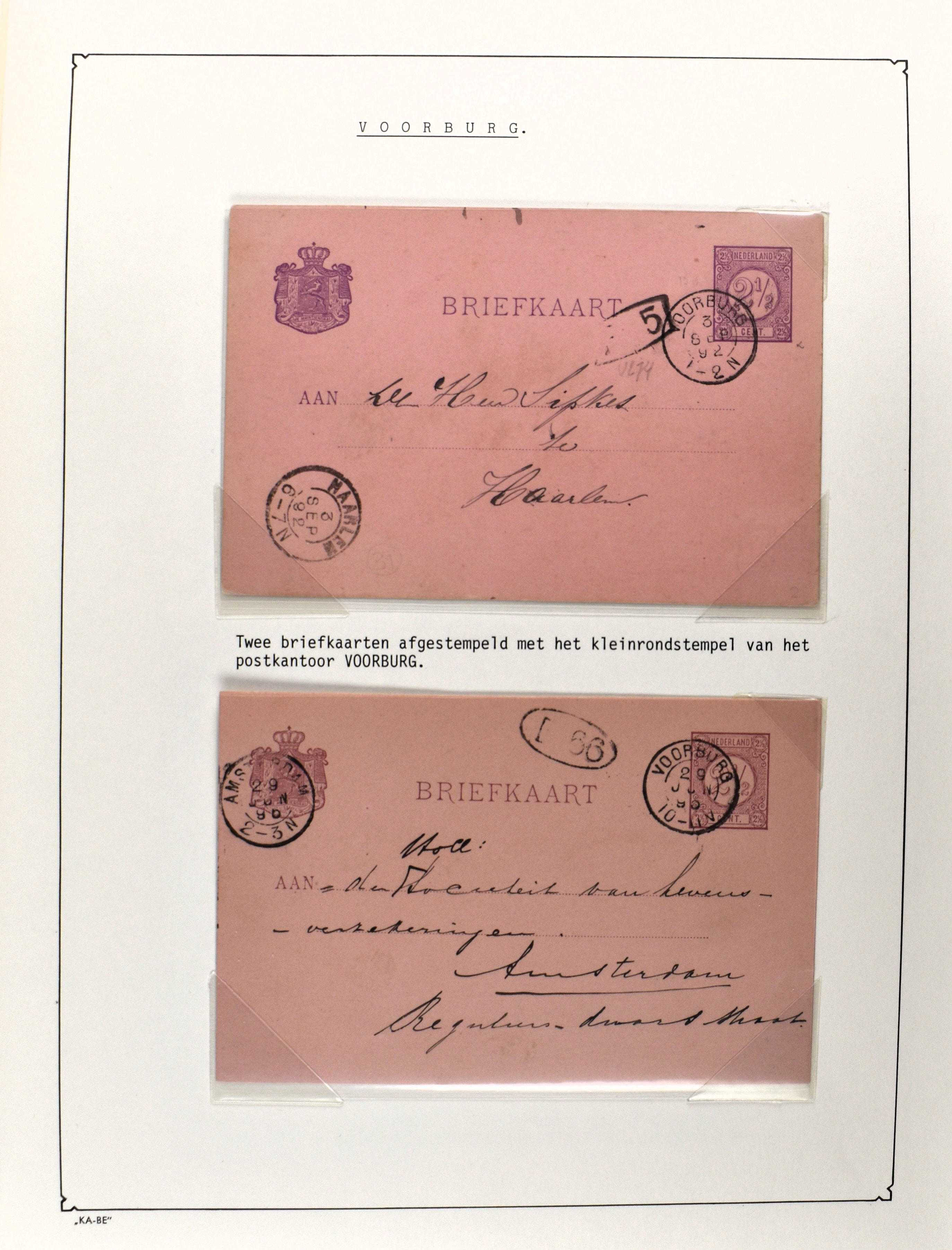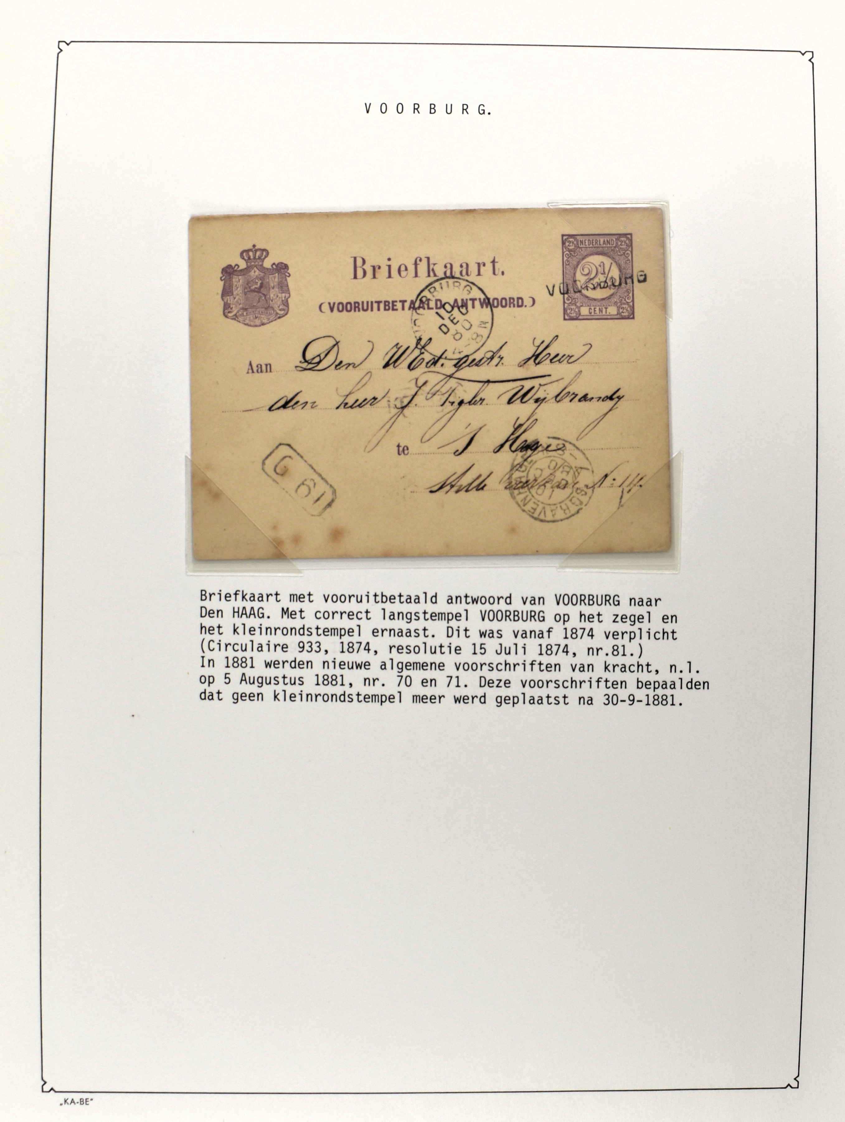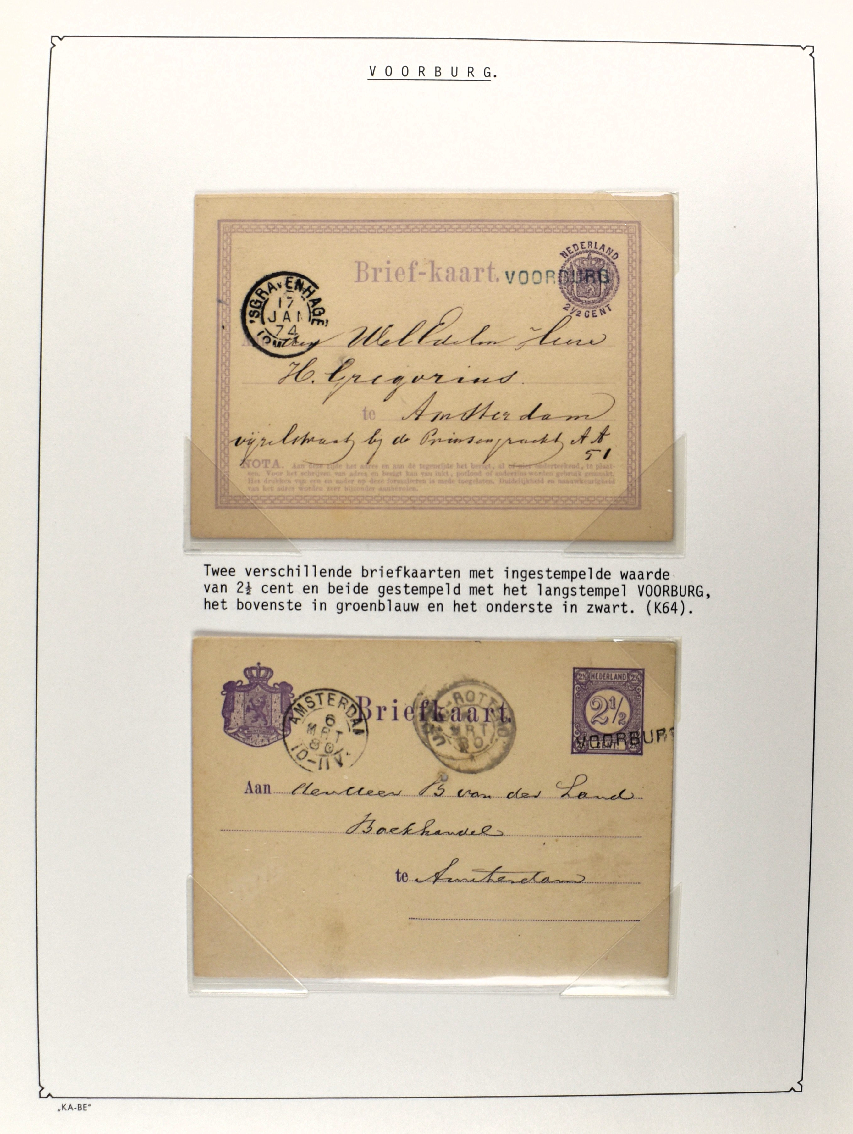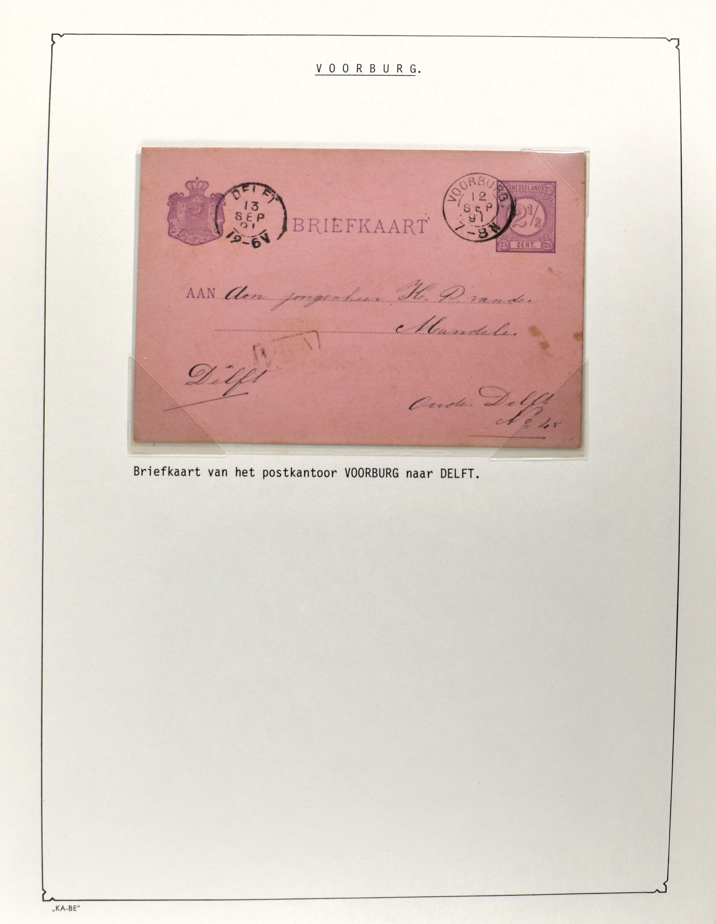 POSTHISTORIE VOORBURG, gespecialiseerde verzameling van ca. 60 poststukken uit of naar Voorburg vanaf periode voorfilatelie, met een grote verscheidenheid aan stempels, frankeringen, soorten poststukken, dienstpost, aangetekend (R-strookjes ook van bijpostkantoren), aangegeven waarde, beport, censuur, etc. en tevens wat documenten, punt- en kleinrond op losse zegels van diverse emissies en waarden, op bladen in KaBe-album