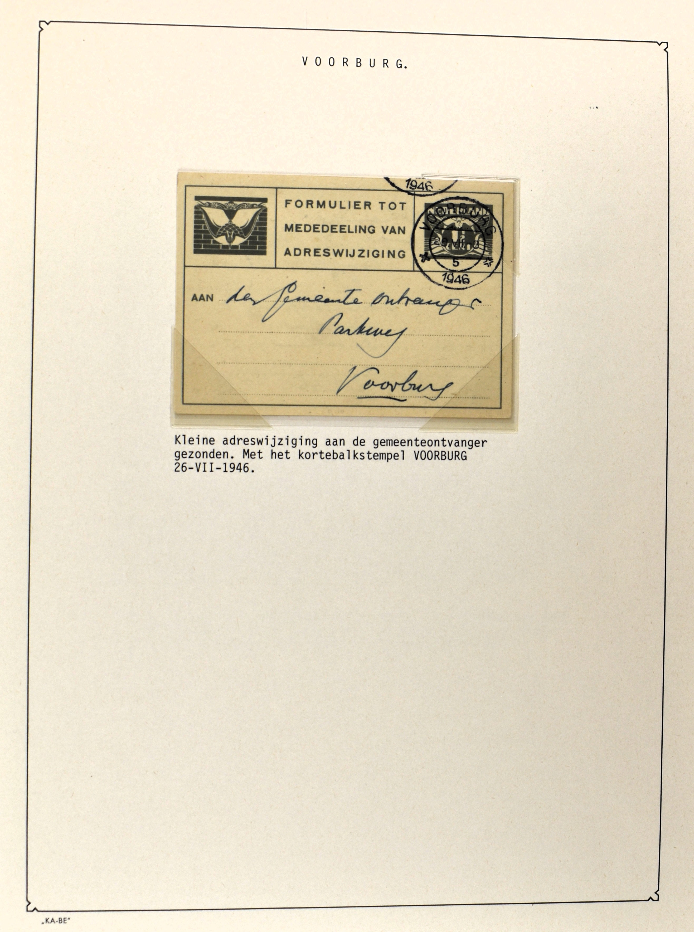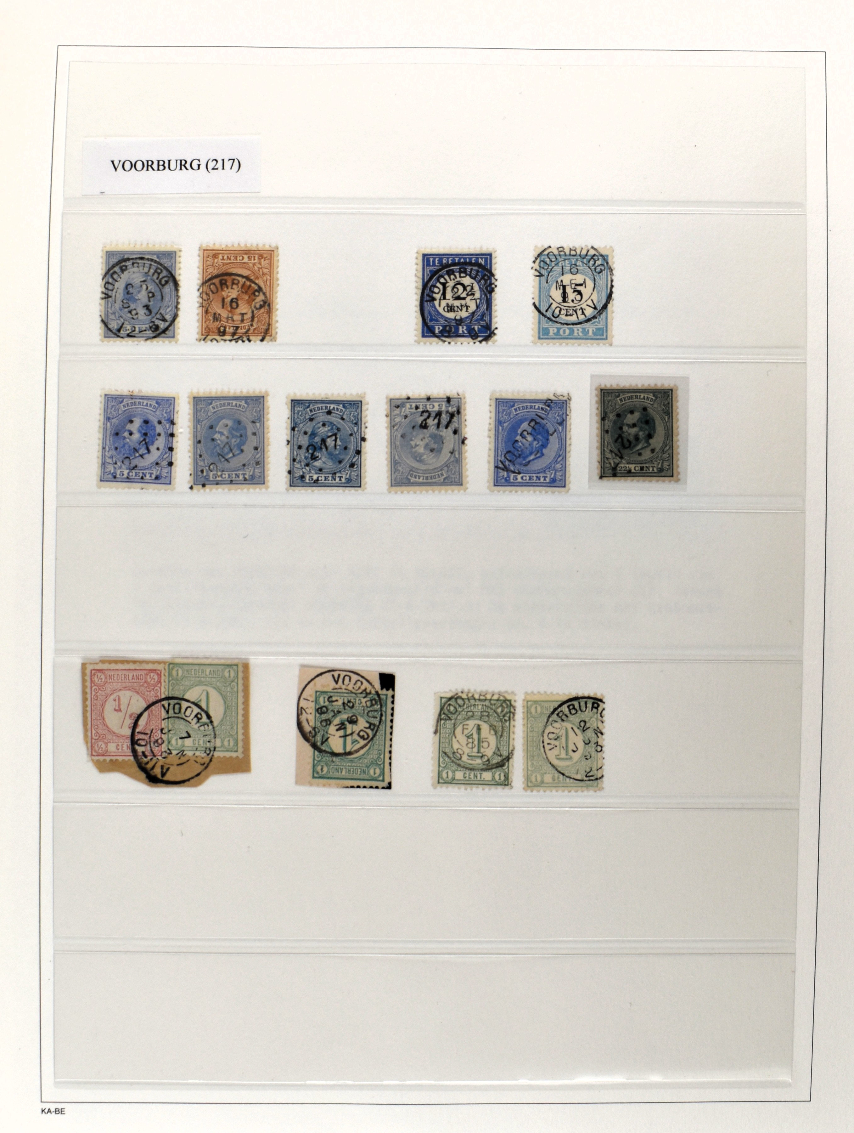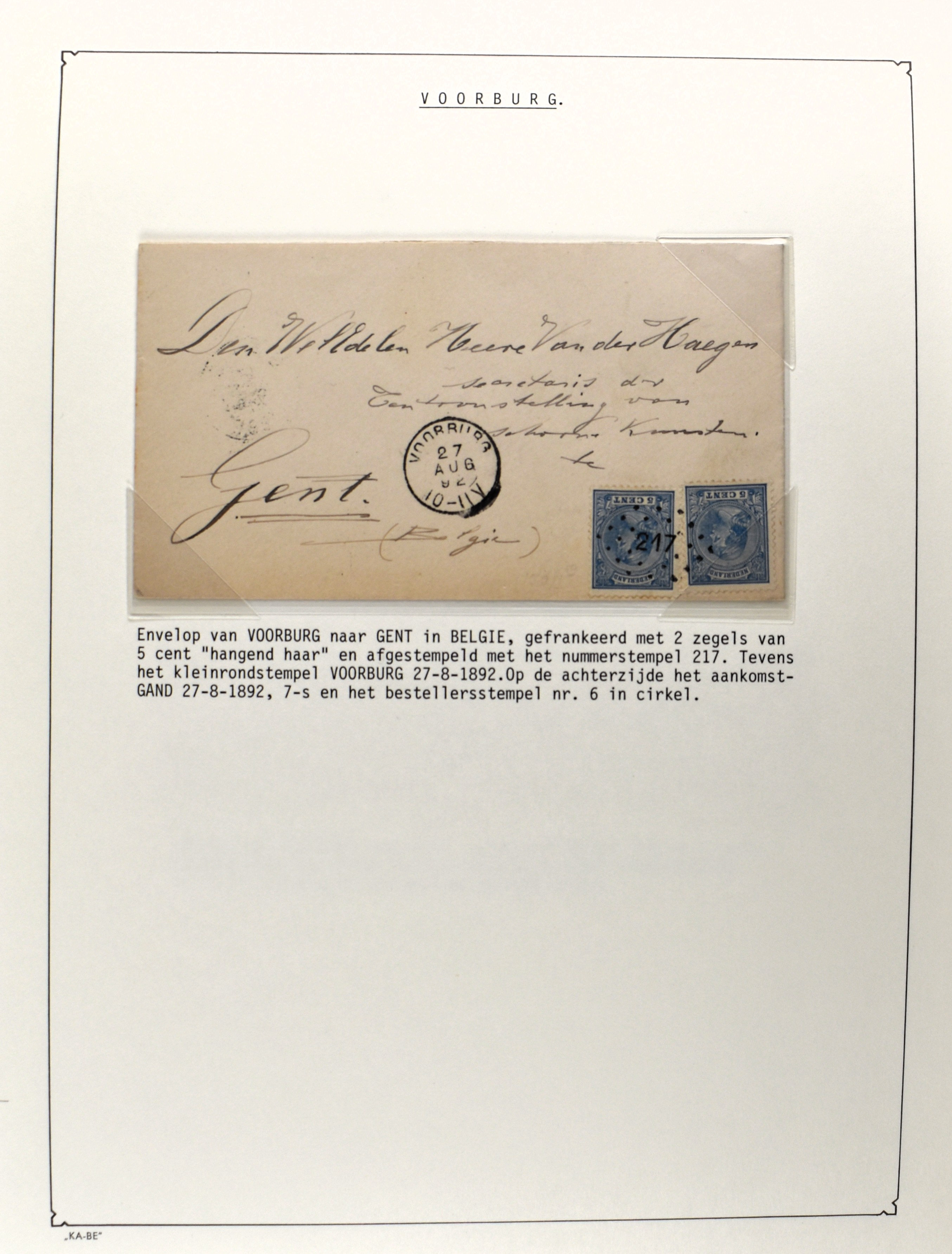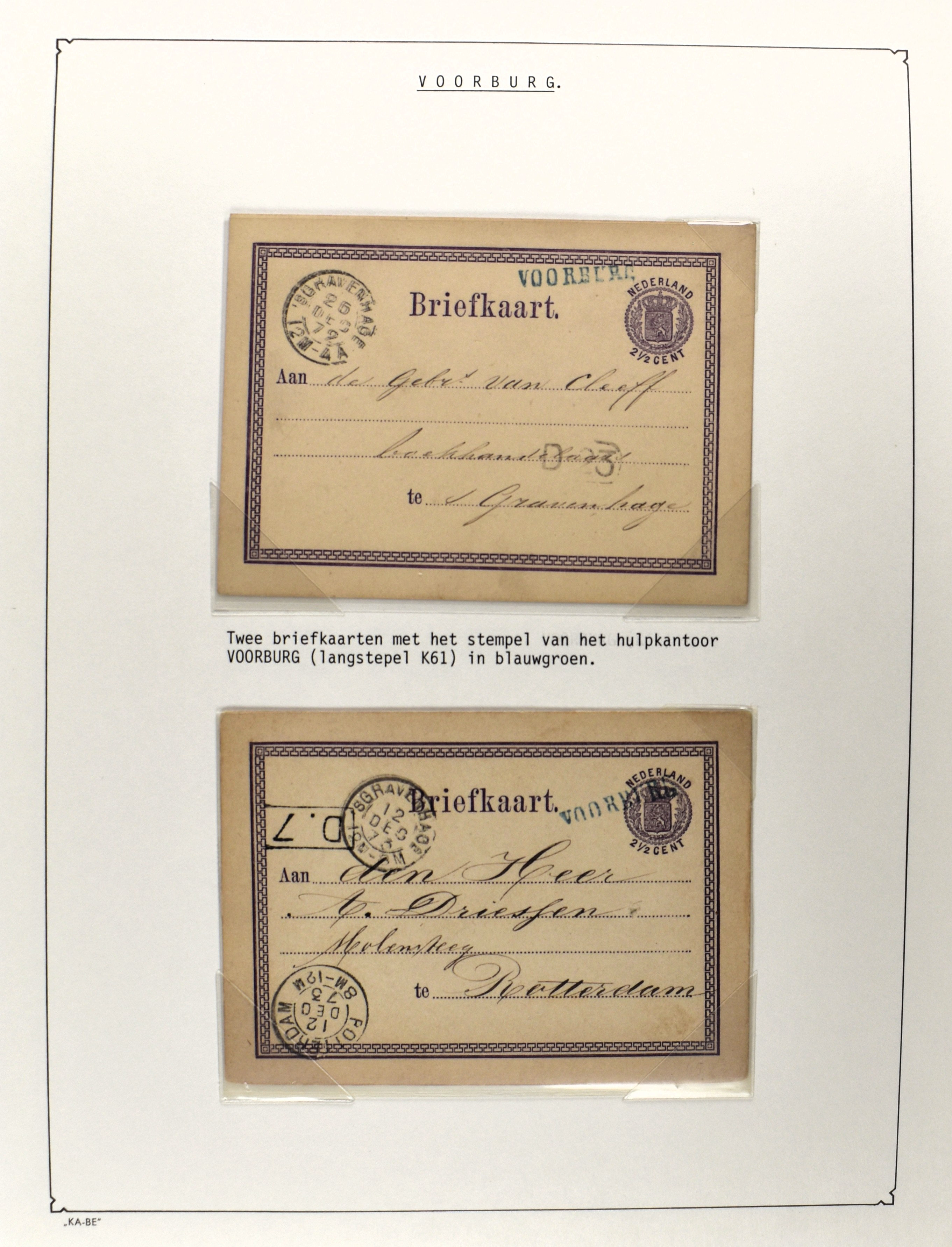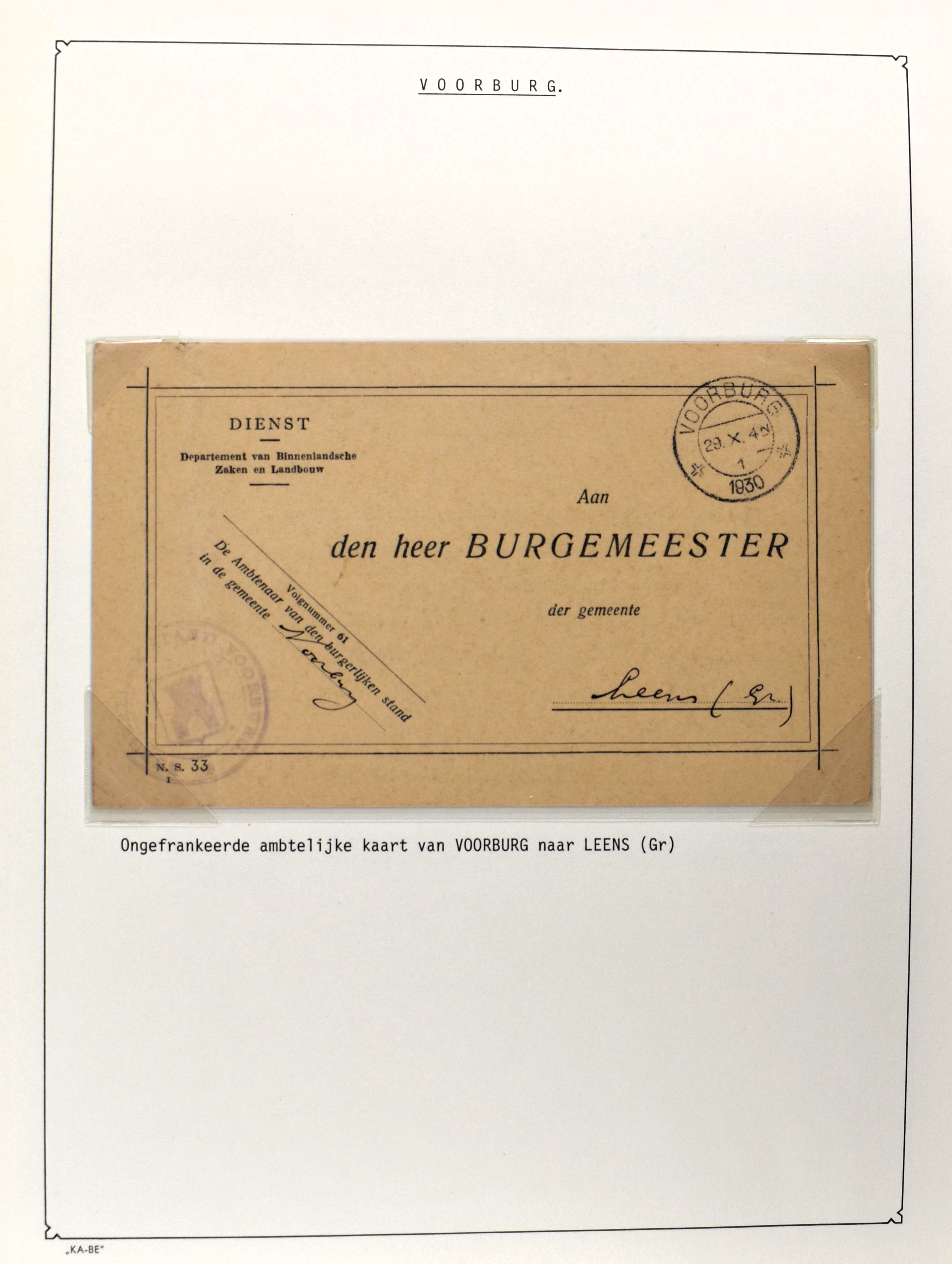 POSTHISTORIE VOORBURG, gespecialiseerde verzameling van ca. 60 poststukken uit of naar Voorburg vanaf periode voorfilatelie, met een grote verscheidenheid aan stempels, frankeringen, soorten poststukken, dienstpost, aangetekend (R-strookjes ook van bijpostkantoren), aangegeven waarde, beport, censuur, etc. en tevens wat documenten, punt- en kleinrond op losse zegels van diverse emissies en waarden, op bladen in KaBe-album