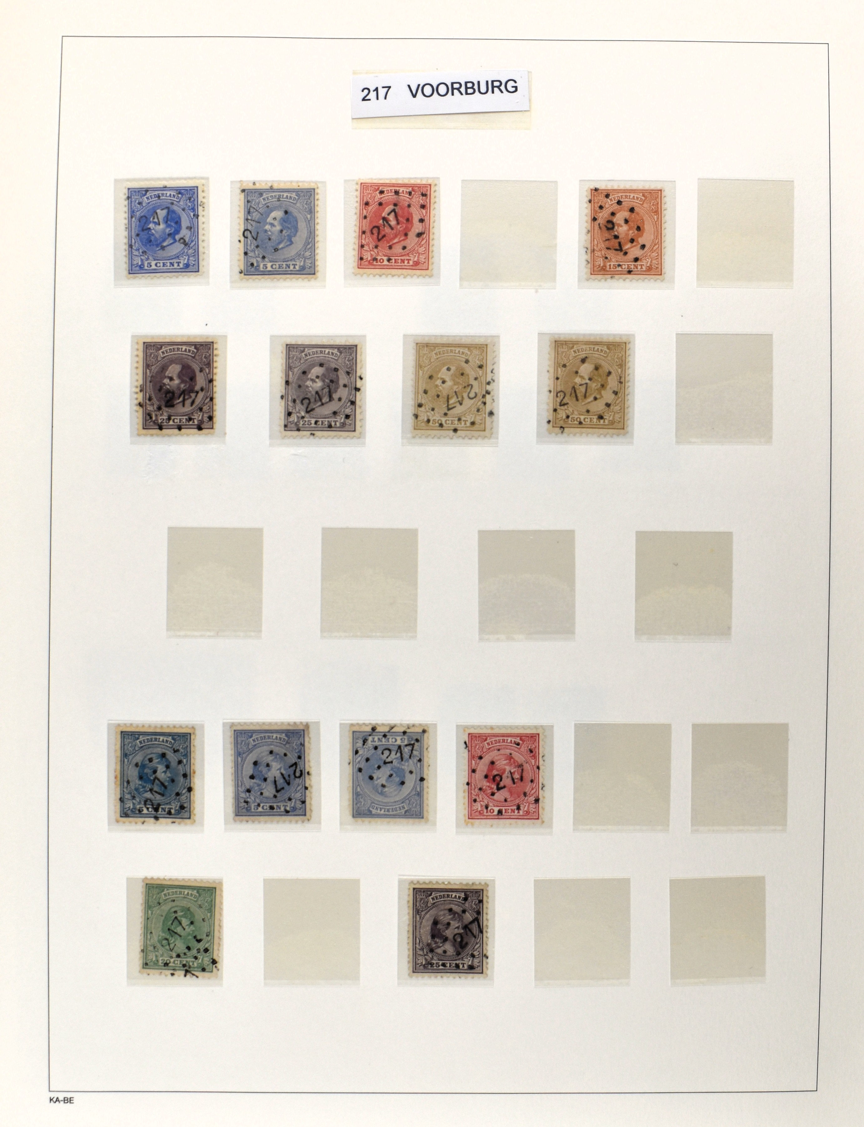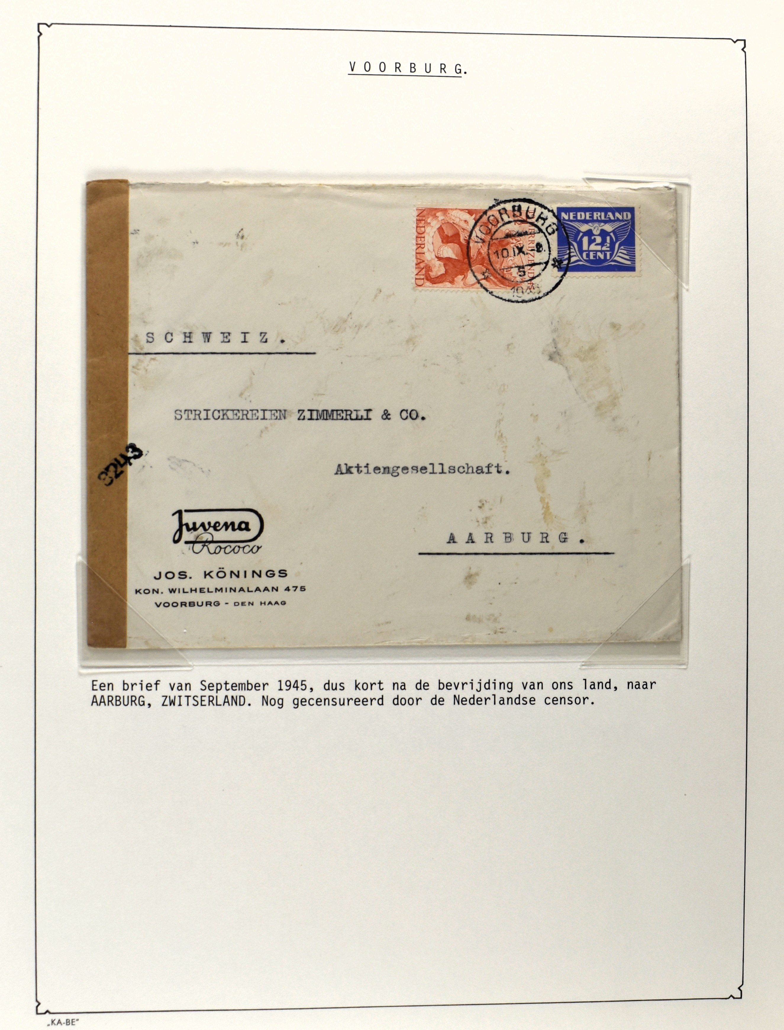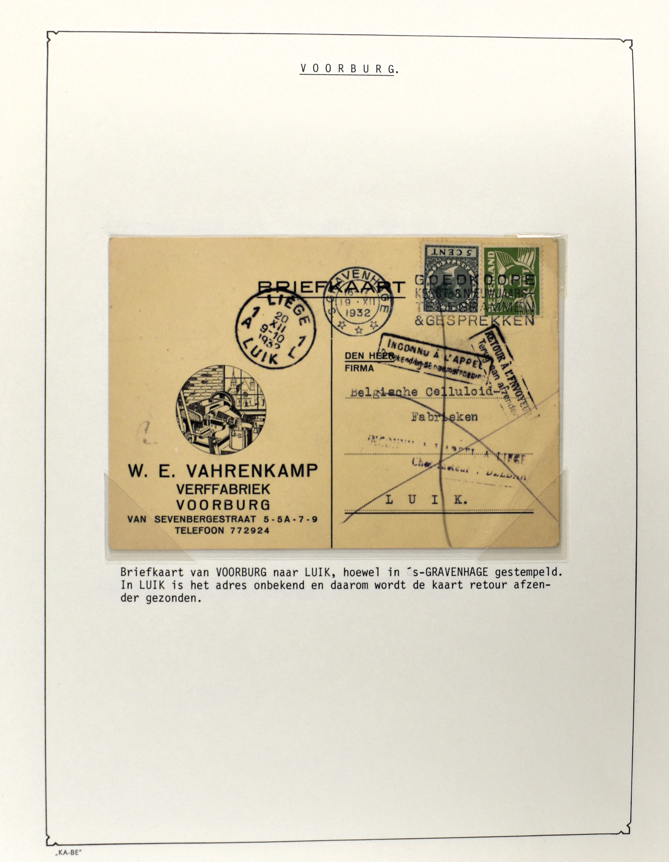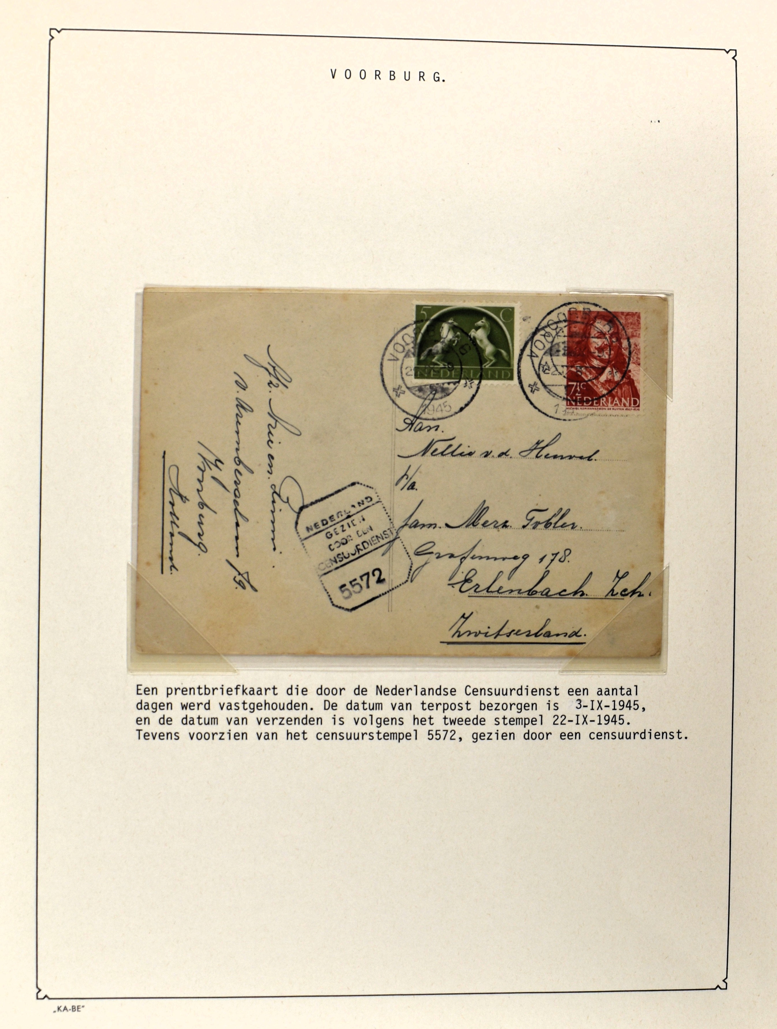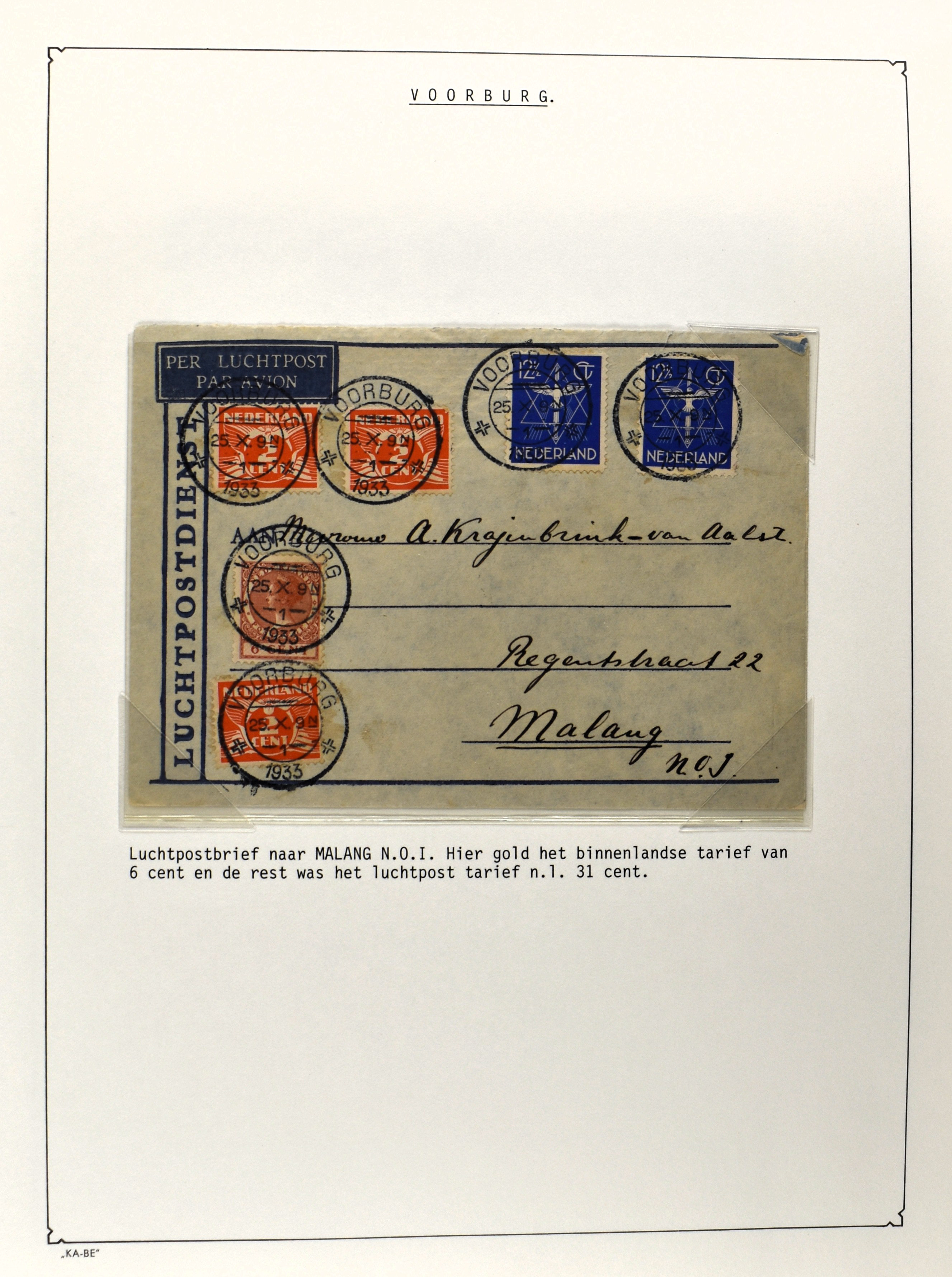 POSTHISTORIE VOORBURG, gespecialiseerde verzameling van ca. 60 poststukken uit of naar Voorburg vanaf periode voorfilatelie, met een grote verscheidenheid aan stempels, frankeringen, soorten poststukken, dienstpost, aangetekend (R-strookjes ook van bijpostkantoren), aangegeven waarde, beport, censuur, etc. en tevens wat documenten, punt- en kleinrond op losse zegels van diverse emissies en waarden, op bladen in KaBe-album