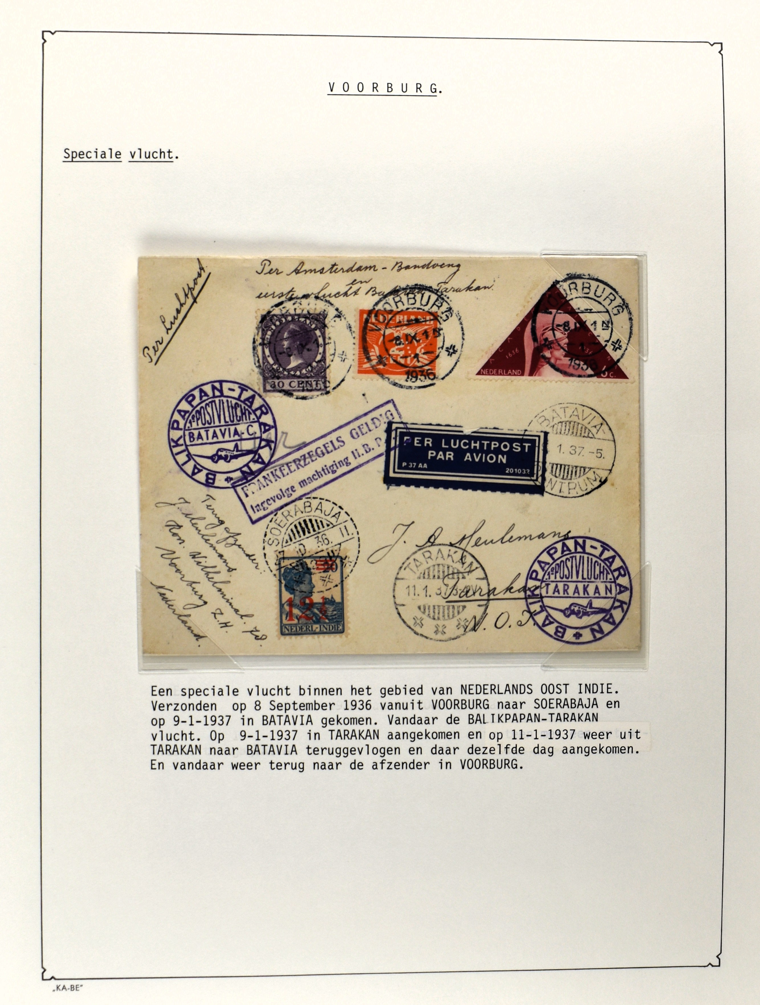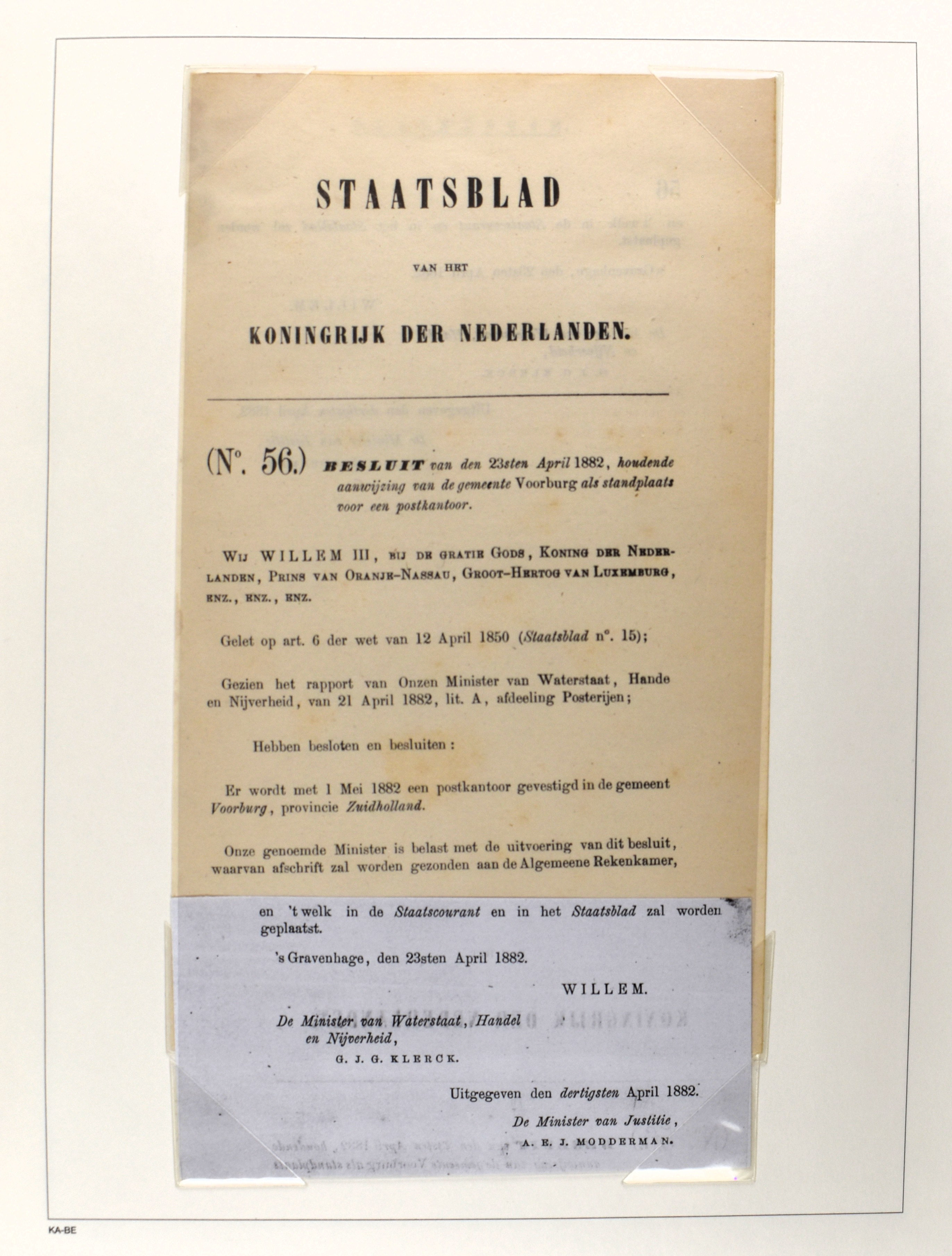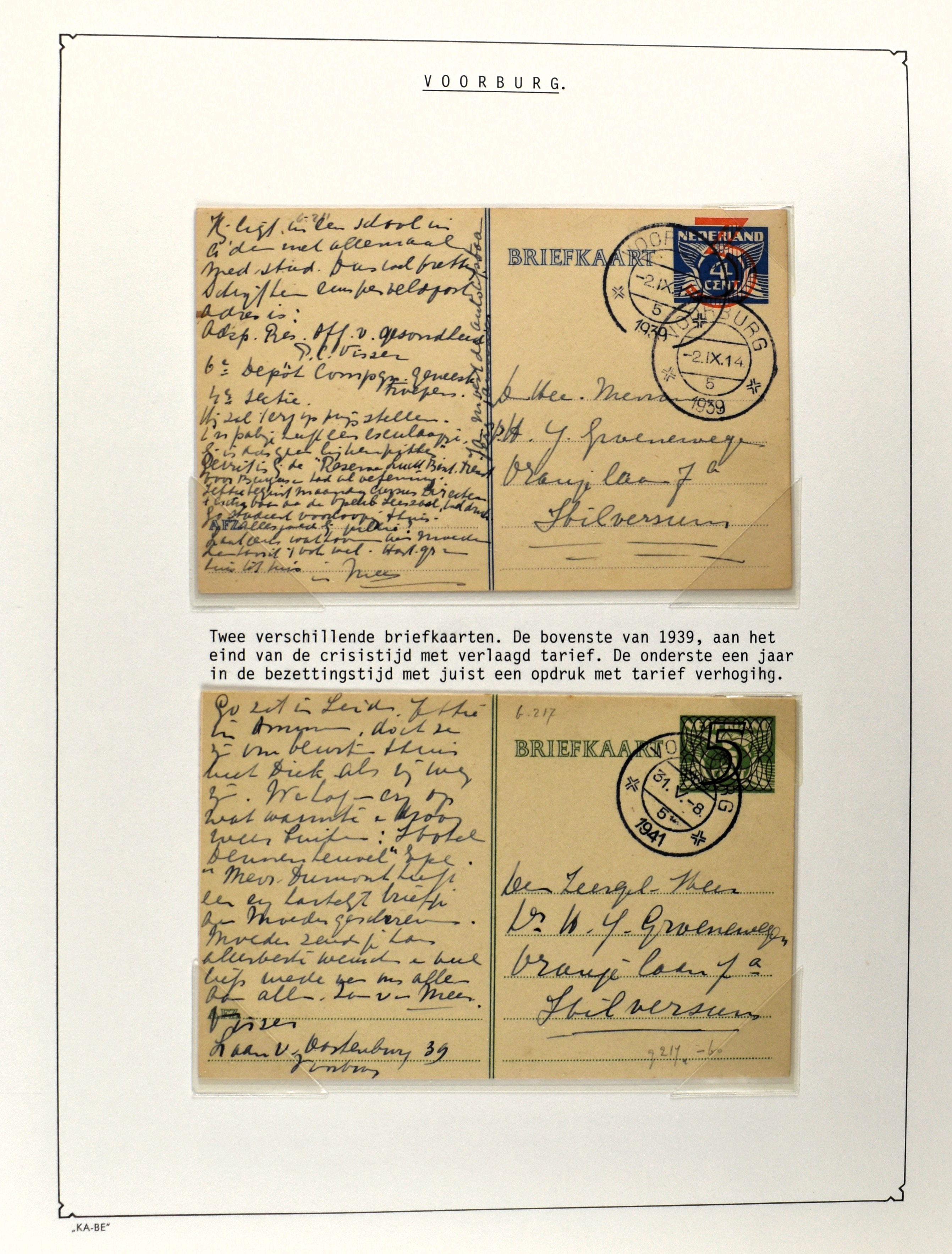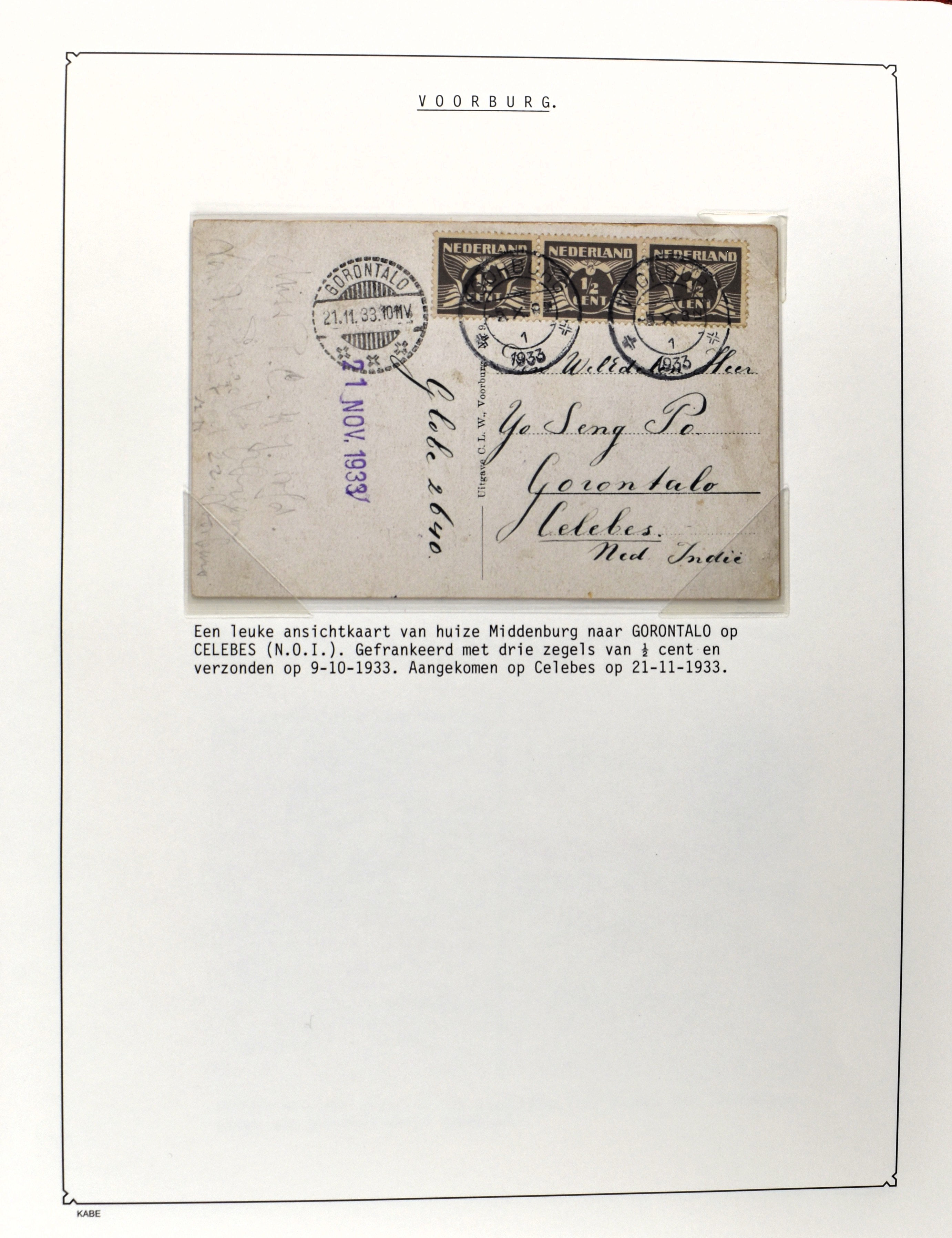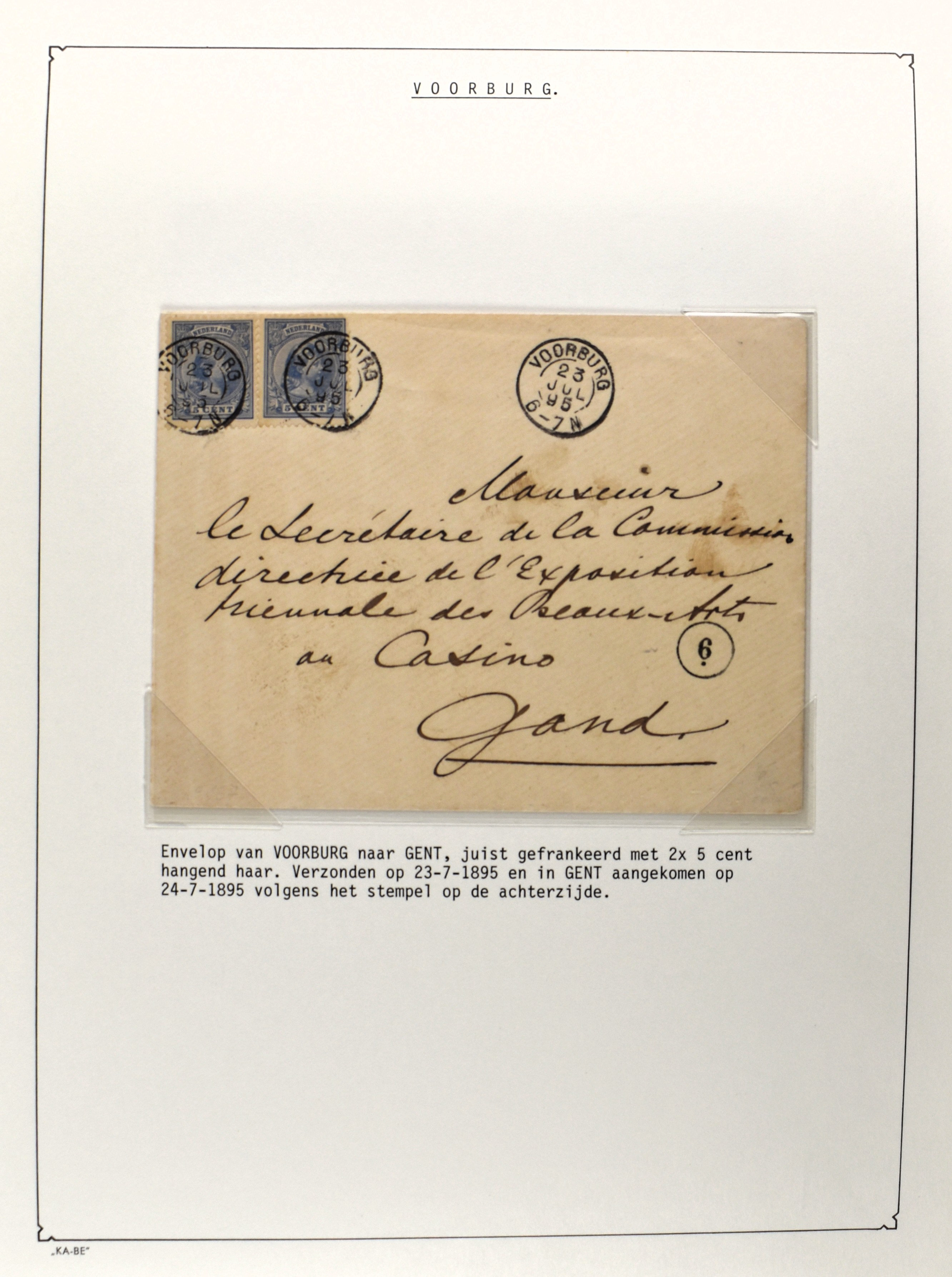 POSTHISTORIE VOORBURG, gespecialiseerde verzameling van ca. 60 poststukken uit of naar Voorburg vanaf periode voorfilatelie, met een grote verscheidenheid aan stempels, frankeringen, soorten poststukken, dienstpost, aangetekend (R-strookjes ook van bijpostkantoren), aangegeven waarde, beport, censuur, etc. en tevens wat documenten, punt- en kleinrond op losse zegels van diverse emissies en waarden, op bladen in KaBe-album