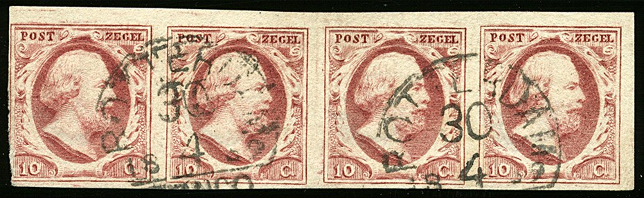 2h-Pl.V-36/40. Linker zegel aangesneden, rechter klein vouwtje, overigens frisse strip van vier