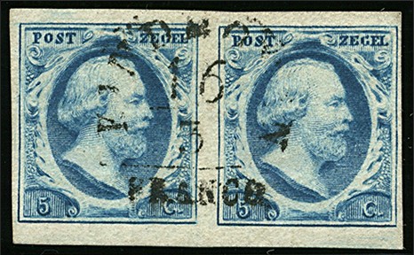 EINDHOVEN A (EY.RR) op 5 cent. Prachtpaar met de als gewoonlijk wat lichte, doch volledige afdruk van dit zeer zeldzame stempel