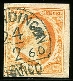 VLAARDINGEN C in blauw (EY.RRR) op 15 cent. Aan drie zijden breed gerande zegel waarop groot deel van dit in deze kleur op de 15 cent extreem zeldzame stempel