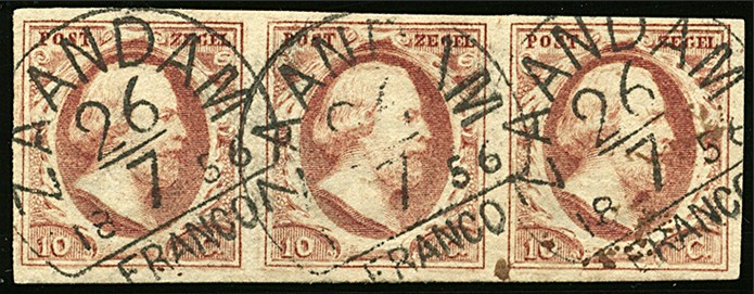 ZAANDAM C groot (EY.50) op 10 cent nr. 2e-Pl.III-43/45. Mooi gerande strip van drie (rechterzegel heeft paar kleine vlekjes) met op elke zegel een mooie, scherpe afst.