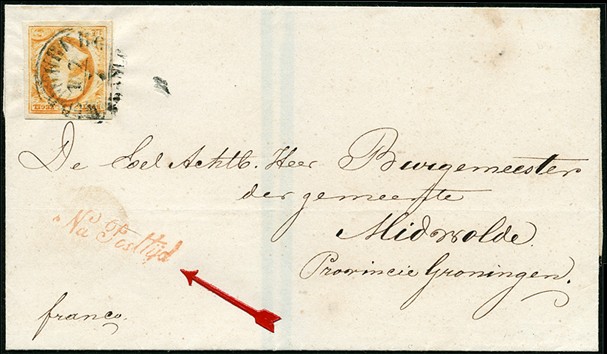 MIDDELBURG A (EY.125) op 15 cent. Prachtex. met wat bewogen afst. op ongedateerde rouwbriefomslag van 17-7 (1852?) naar Midwolda, met op vz. in rood 'Na Posttijd' cursief