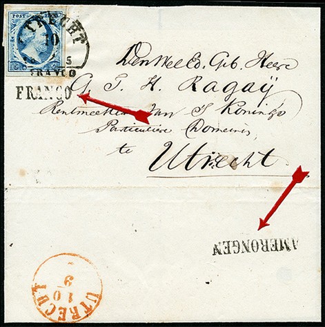UTRECHT B (EY.50) op 5 cent. Prachtex. met duidelijke afst. (jaartal niet afgedrukt) op briefomslag van Amerongen (az. naamstempel) naar een rentmeester te Utrecht 10-9-185? Onder de zegel 'FRANCO' zonder kader (door Amerongen?)