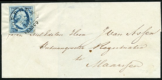 WOERDEN A (EY.250) op 5 cent. Prachtex. (miniem knipje rechtsonder ver van zegelbeeld) met complete afst. op frisse briefomslag van 28-10 naar Maarssen (1853 volgens notitie)