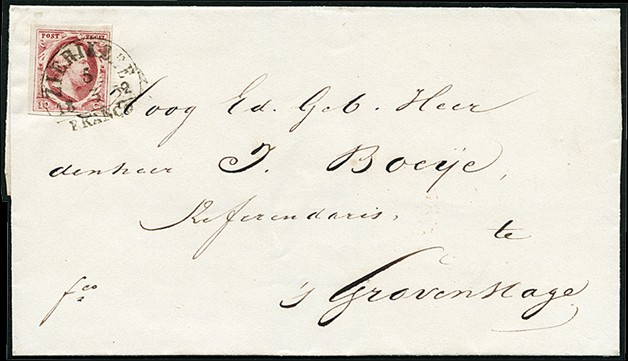 ZIERIKZEE B (EY.150) op 10 cent nr. 2b-Pl.I-96. Prachtex. met goede afst. op zeer frisse briefomslag van 5-3-1852 naar een referendaris te 'sGravenhage 6-3