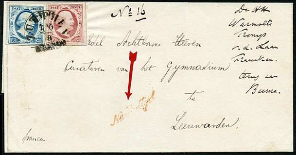 ZUTPHEN A (EY.50) op 5 cent en 10 cent. Prachtex. met centrale afst. op frisse briefomslag van Lochem (az. naamstempel) via Zutphen 10-5 naar de curatoren van het gymnasium te Leeuwarden 12-5-1855. Op vz. cursief 'Na Posttijd' en rechts wellicht de namen van de curatoren