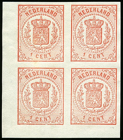 Kleurproeven, ongetand en ongegomd van de 1 cent PC.74d, f en h, pracht resp. nagenoeg prachtblokken van vier Hfl.960