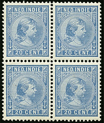26, 20 cent blauw, in luxe postfris blok van vier. Zeldzaam ! € 2400 +