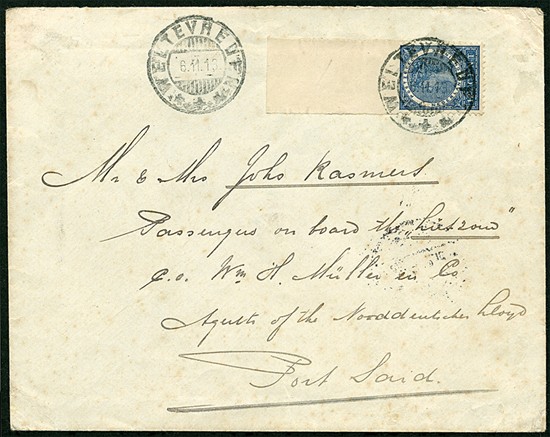 49v, 12½ Cent Veth met variëteit 'Bovenzijde ongeperforeerd'. Prachtex. op envelop van Weltevreden 6-11-1913 naar een opvarende van een schip te Port Said 23-11-1913. De zegel is los al zeldzaam, maar op poststuk (met 12½ cent correct gefrankeerd!) kennen wij geen tweede. Opinie SvL: De zegel is echt en hoort op deze envelop. € 800+++
