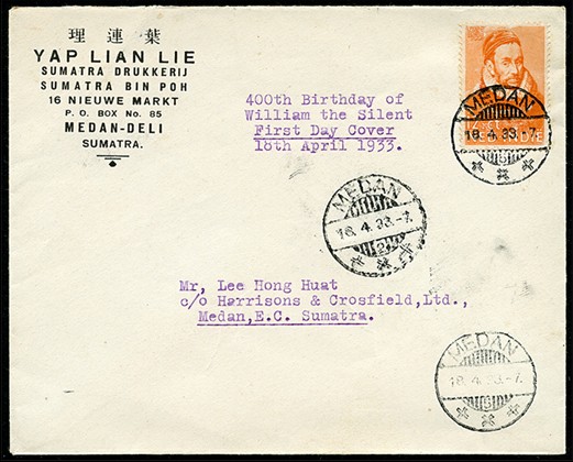 180, Willem van Oranje met eerste dag-afstempeling Medan 18-4-1933 op firmacouvert. Av. RRR