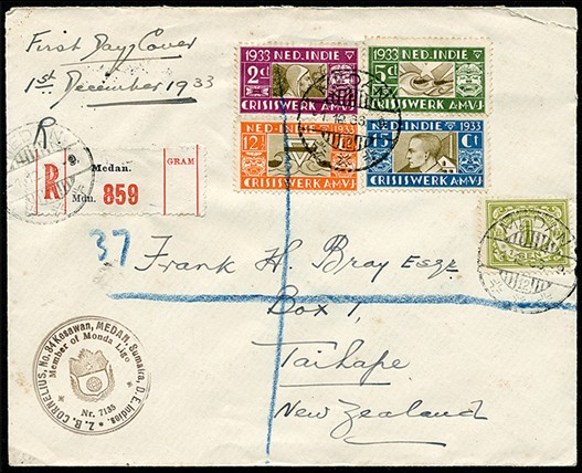 182/85, A.M.V.J.-serie met eerste dag-afstempeling op R-brief van Medan 1-12-1933 via Singapore 4-12 naar Taihape, Nieuw-Zeeland, 2-1-1934. Av. € 340