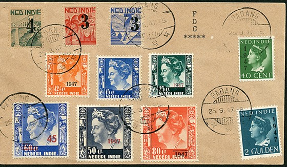 322/25 en 326/31, Hulpuitgifte en 1947-opdrukken met eerste dag-afstempeling Padang 25-9-1947 op envelop. Av. RRR