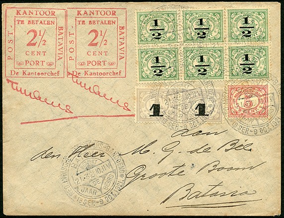 Noodportstempels. NP1 twee keer afgedrukt op locaal verzonden envelop met propagandastempel van Batavia 21-3-1921. € 200
