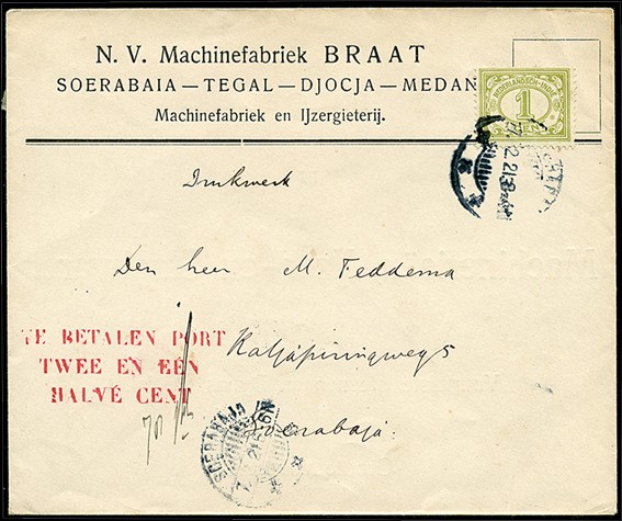 Noodportstempels. NP2 op mooi drukwerkcouvert locaal verzonden te Soerabaja 7-2-1921. € 200