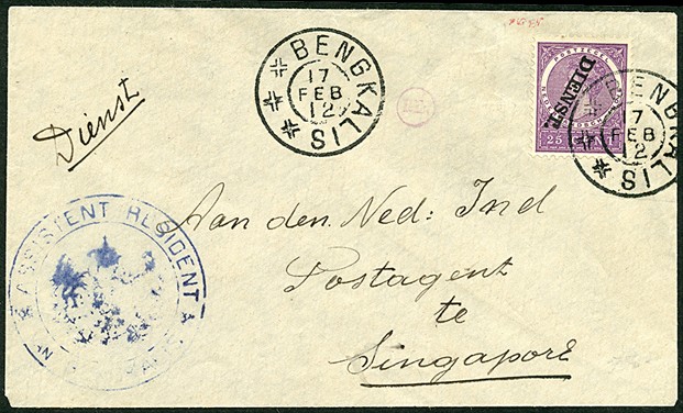 D23f, 25 CENT VETH MET VARIËTEIT 'OPDRUK DIENST. KOPSTAAND'. PRACHTEX. OP ENVELOP (KLEP ONTBR.) ALS DIENSTBRIEF VERZONDEN DOOR DE ASSISTENT RESIDENT VAN BENGKALIS, 2x LUXE AFGESTEMPELD MET GROOTRONDSTEMPEL BENGKALIS 17 FEB 12, NAAR DE NED.-INDISCHE POSTAGENT TE SINGAPORE (AZ. GROOTROND N.I.POSTAGENT SINGAPORE 19 FEB 12). KEUR 'NED. BOND', ATTEST 'MOEIJES 1989'. GROTE RARITEIT EN HET ENIGE EX. DAT ONS OP POSTSTUK BEKEND IS. € 1750+++