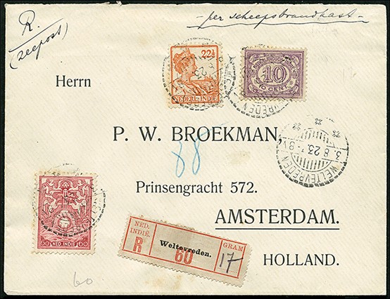 BK1, BK3, Brandkastzegels van 15 cent in paar en 75 cent op met in totaal 57½ cent bijgefrankeerde envelop van 20 cent, aangetekend van Weltevreden- / Kramat 13-4-1923 per scheepsbrandkast naar Amsterdam. Tevens Broekmanenvelop waarop BK2 aangetekend van Weltevreden 3-8-1923 naar Amsterdam