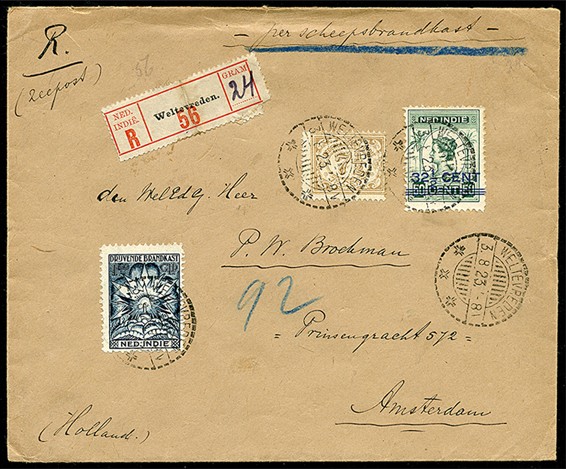 BK4, Brandkastzegel van 1,50 gulden tezamen met zegels van 7½c en 32½c op zeer frisse aangetekende envelop van Weltevreden 3-8-1923 per scheepsbrandkast naar Amsterdam