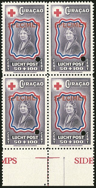 Luchtpost 45/52, cpl. serie in postfrisse blokken van 4 met opdruk Specimen en perforatiegat van the American Bank Note Co. Zeldzaam !