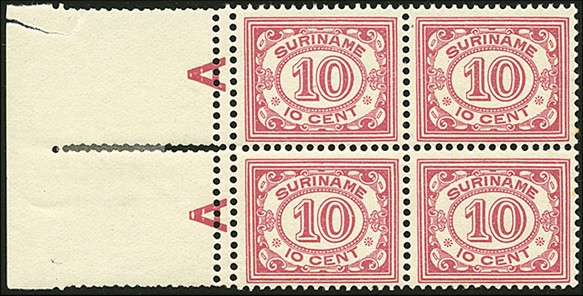 86, 10 cent karmijn in postfris blok van vier, tanding 12½ met variëteit: extra perforatieslag waardoor dubbele perforatie met 'Diamanttanding' is ontstaan met cert. Vleeming (2015)