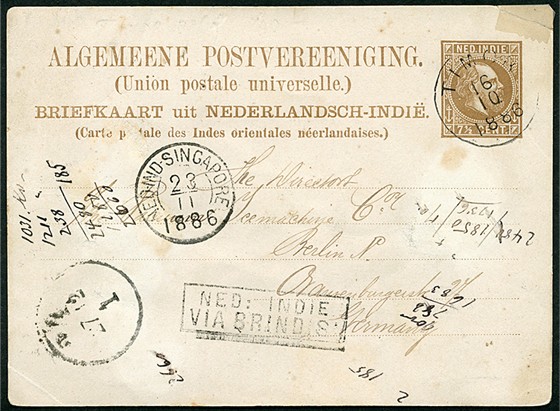 Bk. G5 (iets gehavend) van TIMOR 16-10-1886 via Makassar 8-11 over de Ned.Ind.Singapore 23-11 via Brindisi (routest.) naar Duitsland. Schaars rondstempel (SvL 200)