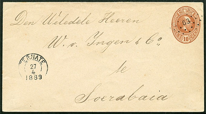 Env. G6 afgest. puntstempel 63 van TERNATE 27-4-1889 naar Soerabaja 14-5