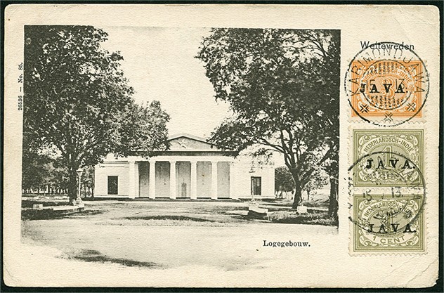 Prentbk. met op beeldzijde 1c en 3c JAVA.-opdruk, afgest. met kortebalk KARIMONDJAWA 15-1-1913, naar de USA. De afz. schreef de kaart te Djoewana op 6-1-1913 (KB, SvL R)