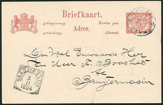 Bk. G14 geschreven op 25-10-1904, in blauw afgest. met rondstempel van fungerend hulppostkantoor KWALAKA / POEAS / DAJAK/LANDEN en verz. naar Bandjermasin 5-11