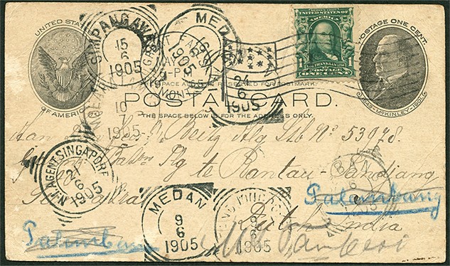 Amerikaanse bk. uit Great Falls 5-5-1905 op zoek naar de geadresseerde op Sumatra, o.a. te SIMPANGAWAS 15-6-1905 (VK, SvL RR)