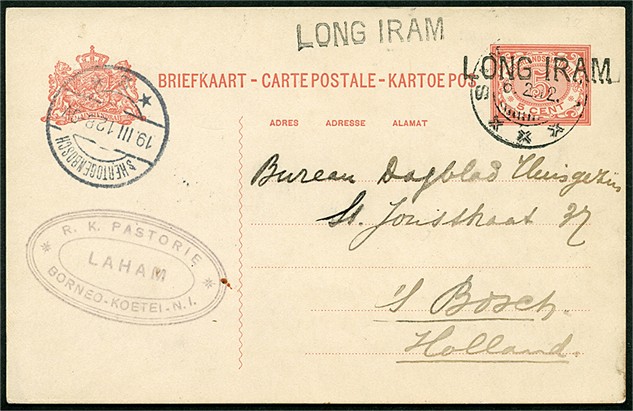 Bk. G17 op 29-1-1912 geschreven te Laham, via LONG IRAM over Samarinda 6-2 naar 'sHertogenbosch 19-3. Twee superbe afdrukken van dit opwindende naamstempel (SvL 250)