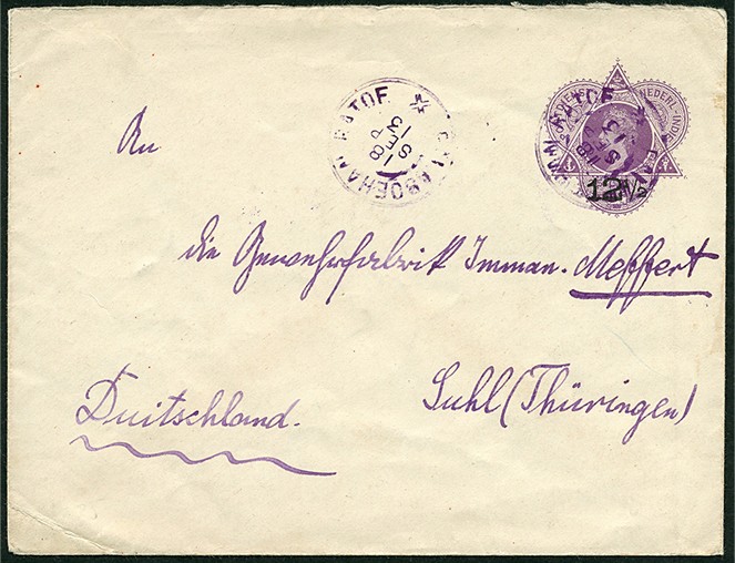 Env. G30 in violet afgest. grootrond PALABOEHANRATOE 18-9-1913 via Tjibadak 18-9 en Weltevreden 19-9 naar Duitsland (GR, SvL 250)