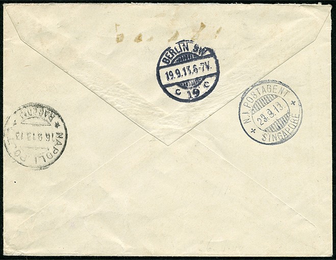 Env. G31 bijgefr. met 5c aangetekend van Bandjermasin 19-8-1913 over Napels 16-9 naar Berlijn 19-9 met op az. prachtafdruk kortebalk N.I.Postagent / Singapore 23-8