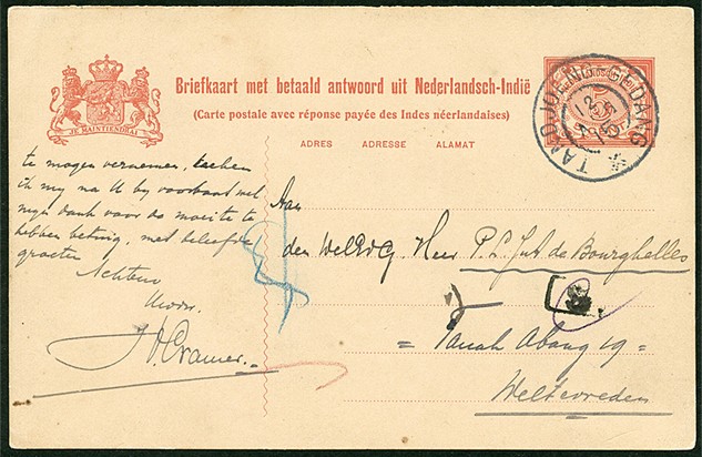 Bk. G22 (V-kaart) prachtig afgest. met grootrond TANDJOENG-GEDANG 12-4-1915, naar Weltevreden (GR, SvL 300)