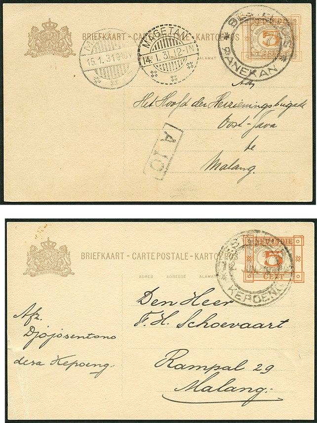 Twee bk. G44 van bestelhuizen naar Malang. Kaart met BESTELHUIS KEPOENG waarin datumstempel 12. JUN. 1931(?), alsmede kaart met BESTELHUIS PANEKAN via Magetan 14-1-1931