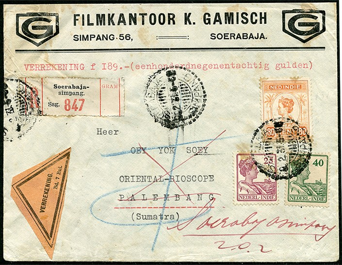 Wat smoezelige envelop van een filmkantoor gefr. met 25c, 40c en 80c, als verrekenzending ƒ 189 van Soerabaja- / Simpang 9-2-1931 naar Palembang, en na enige vruchteloze zoekpogingen weer retour 1-3