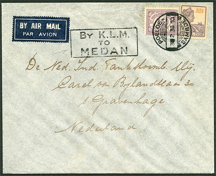 Luchtpostenv. naar Den Haag gefr. met 10c en 32½c prachtig afgest. POELOE- / SAMBOE 3-2-1936 (PV1, SvL 275) waarnaast 'By K.L.M. / TO / MEDAN'. € 250