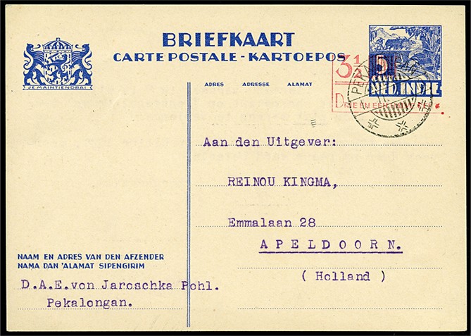 Bk. G60, de drietalige opdrukkaart, van Pekalongan 1-11-1937 naar Apeldoorn. € 300