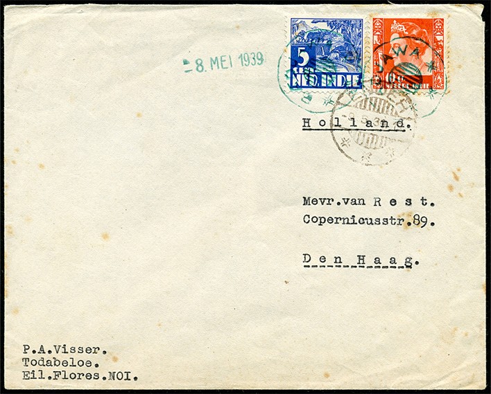 Env. gefr. met 5c en 10c (iets roest) beide in groen afgest. met bestelhuisstempel BADJAWA met datumstempel -8. MEI 1939 via Endeh 9-5-1939 naar Den Haag