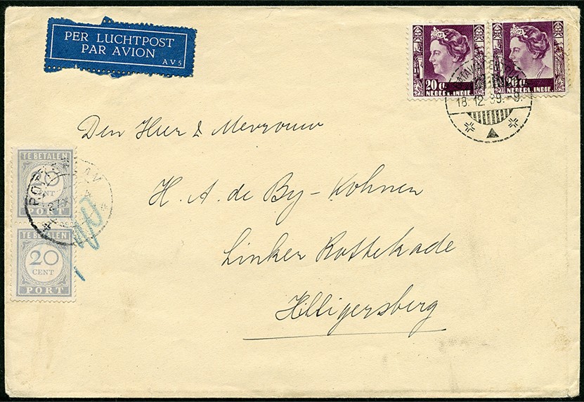 Luchtpostenv. gefr. met 20c in paar (1 ex. fraai), prachtig afgest. met het zeldzame BATAVIACENTRUM 'MET DRIEHOEKJE' 18-12-1939 naar Rotterdam en daar op 27-12 met 40 cent beport