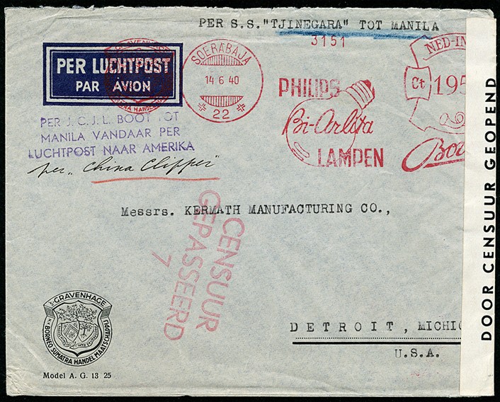Gecens. luchtpostenv. met roodfrankering van 195c van Soerabaja 14-6-1940 met de S.S. Tjinegara naar Manila, routestempel 'PER J.C.J.L. BOOT TOT / MANILA VANDAAR PER / LUCHTPOST NAAR AMERIKA' waaronder geschreven 'per China Clipper', verder naar Detroit. Zeldzaam!