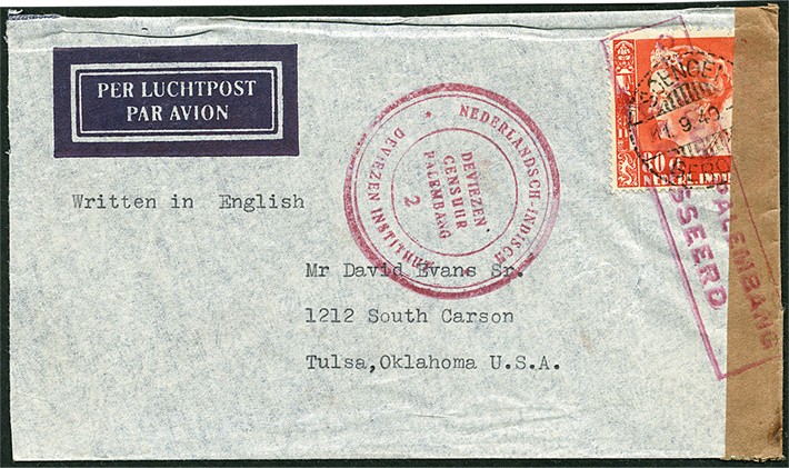 Luchtpostenv. gefr. met 80c van Soengei- / Gerong 11-9-1940 naar de USA en te Palembang gecensureerd (Bu. CD5)
